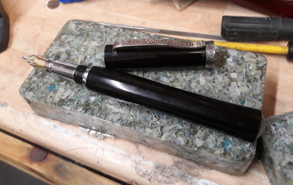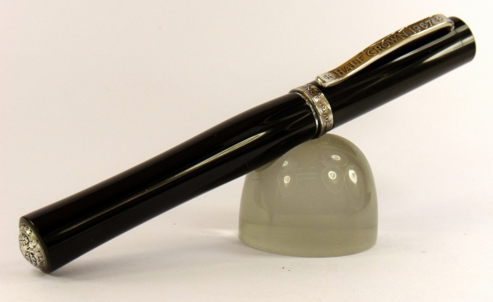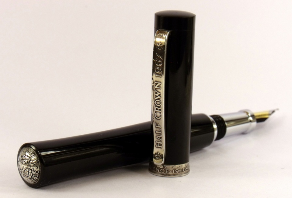 This pen uses the FP section from a Spring Blossom ( I think ) but the rest is custom. The clip is from a 1967 Half Crown ( with reeding removed), The cap ring is made from a 1960 Sixpence and the finial is made by simply doming and recessing a 1936 Thrupence.