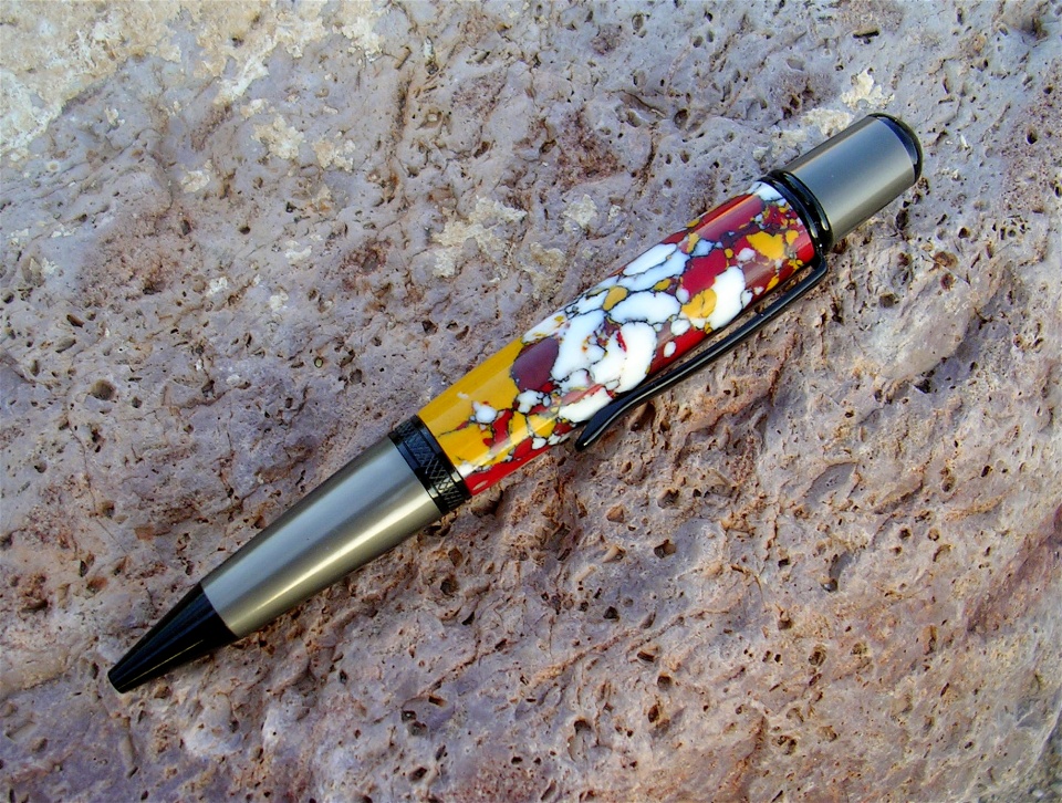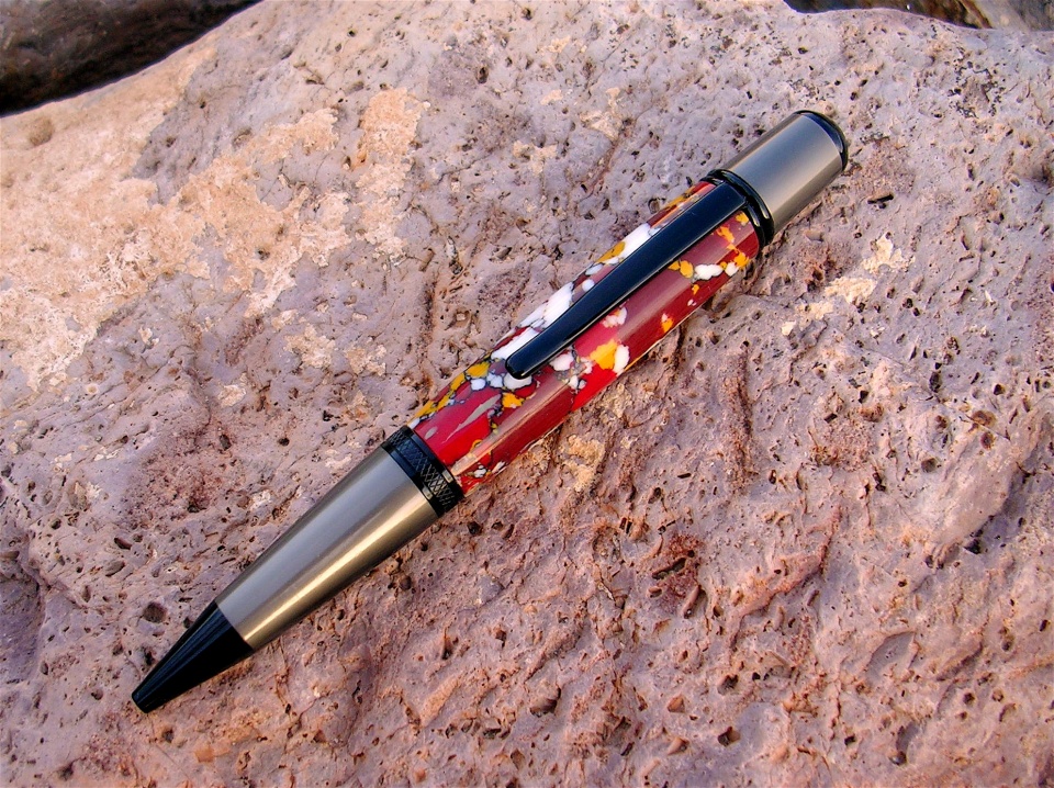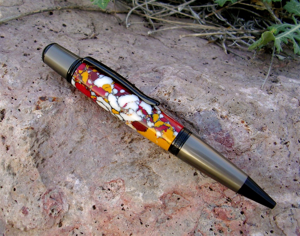 A commissioned Sierra Vista in two toned Black Chrome with a Mookaite Tru-Stone barrel.