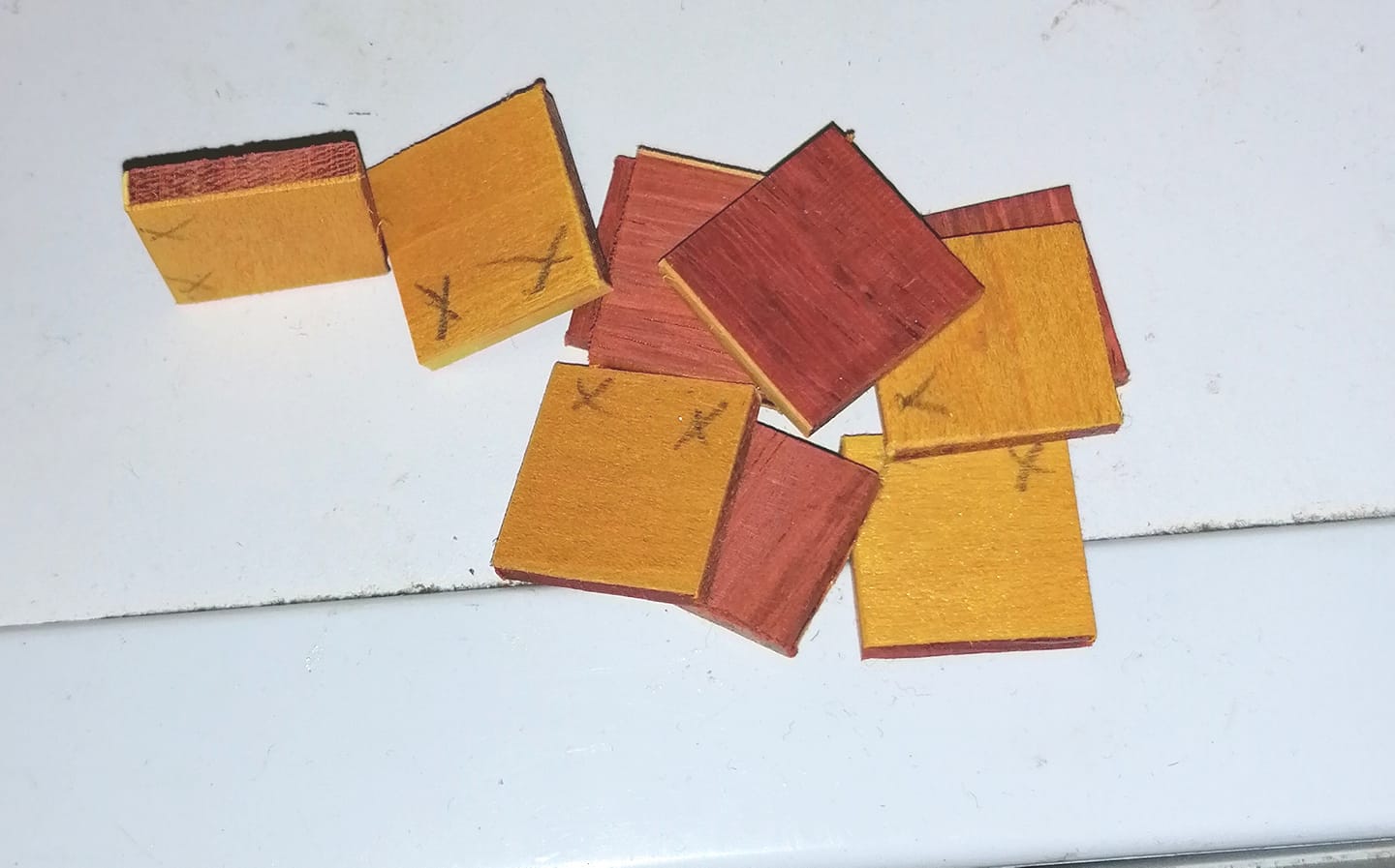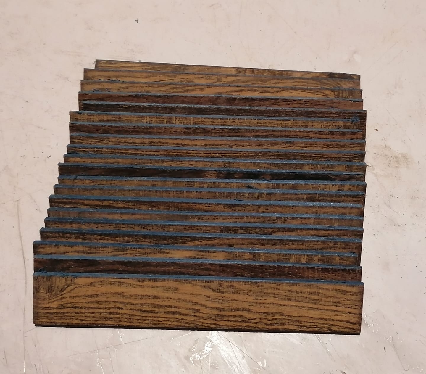 The way he explained it to me is. I will try to post these photos and it should explain it better. Now remember use whatever you want and make whatever thickness you want. This is just basic idea. Now he just grabbed a bunch of his photos so the pictures are not all of the same blanks as you can tell. he starts with a block of wood, he happens to use pen blanks or anything he has. You can use a longer piece to get more slices out of it. he puts the blue veneer on these and then slices in strips to whatever size he needs thus the second photo. ( man I thought I edited this but must have not hit send) Sorry but left important step out. After he slices them he then puts veneer on one face of these slices. Then he wraps all these slices together in saran wrap and cuts squares all at once instead if individual. I should mention the blocks he starts with will be the same as his squares. 4th photo shows the ends that the veneer winds up on. Now this is all predicated on blanks I shown in 5th photo which are the kind he makes. Now if you are attempting something different than I am out and have no clues or answers for you. Hope someone else can help. But these are the type blanks I will be attempting. There is so many patterns you can incorporate within these designs and he does them. he makes alot of kitless pens from these and they are beautiful.