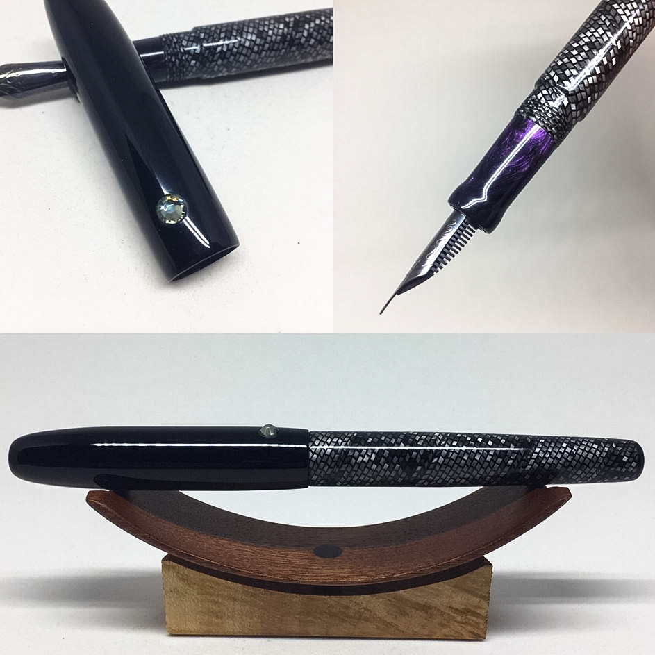 Another vintage celluloid body. I honestly forgot I had some of this gray lizard around and ran across it yesterday. Trimmed with an alumilite front section in a custom mix I use for my elemental pens and a black ebonite cap sporting a crystal roll stop.