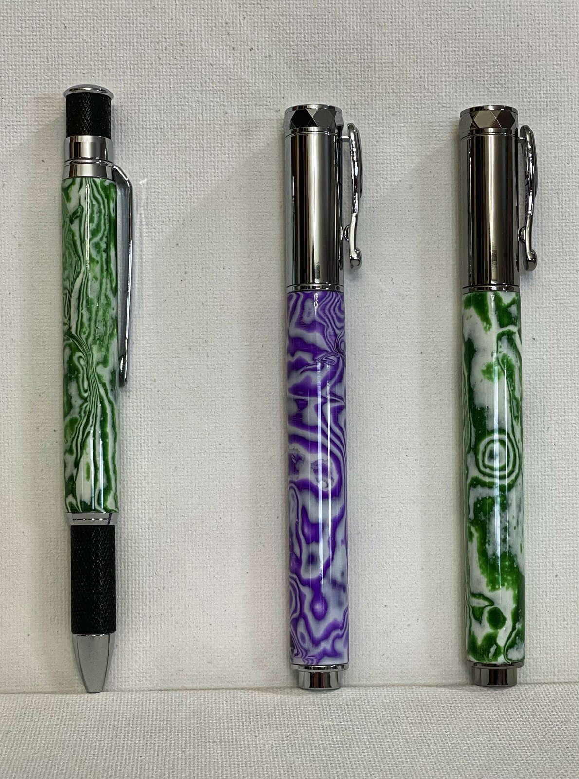 Wasn't really planning on making more of these right away, but my wife wanted to try her hand at making a blank. Also after showing my red and white one, I was asked if I could make a green and white one. Wife made the purple and white blank, I made the others. Two Zens and an original Knurl GT. So far 5 pens with this method and no failures. My wife is keeping the purple one and I'm just going to let the others set on my desk awhile to make sure they don't crack in time. I dont think they will, but this is all he's to me
