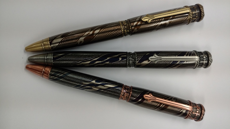 Here are 3 of 8 faith hope love kits from psi. I was wondering if any one else made these, because I found the casting of the center band is not quite up to snuff. It seems the top and bottom are not parallel and I have gaps where it touches the blank, all be it only 2-3 thou out. Im thinking of chucking the bands and giving them a truing up cut. Psi is great about this and sending me some new bands to see if it was just a bad batch. all in all they look good if you dont know what to look fore...lol. Also I tried a new way to temper colour. if you look at the copper pen I did a fade. let me know your thoughts.
