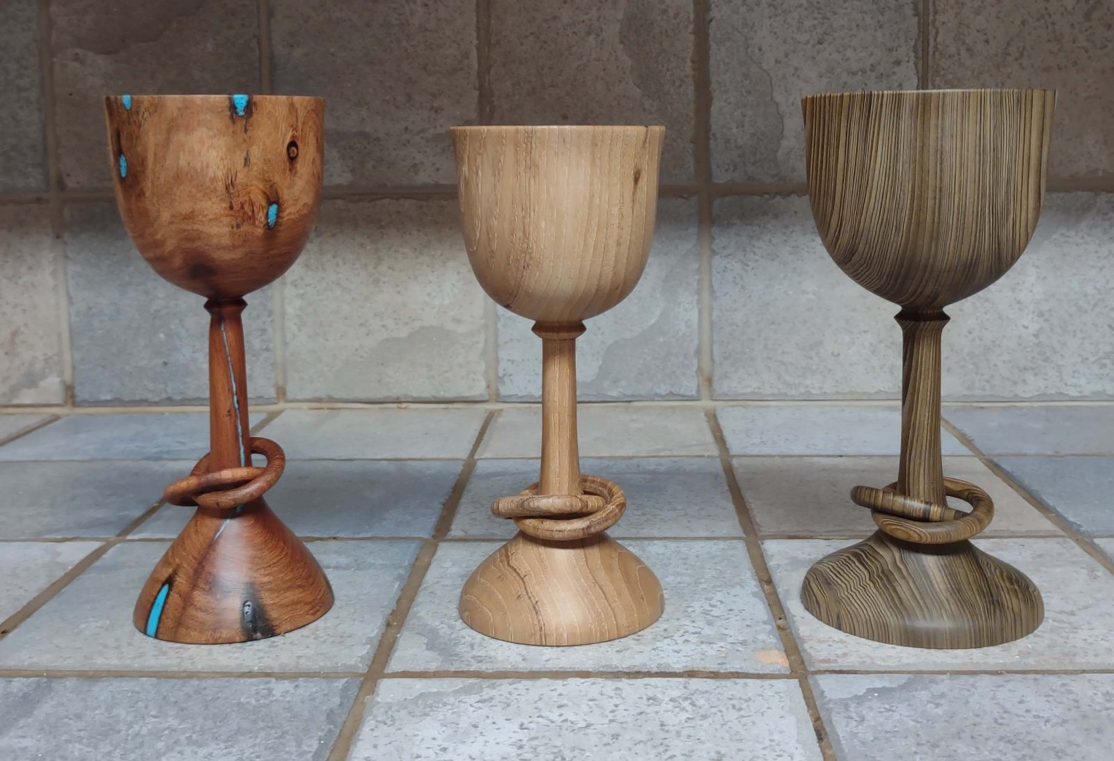 I got three more Wedding Goblets with captive rings done, this gives me 6 goblets on hand, so hopefully that will fulfill any up coming weddings. A Mesquite goblet that was full of beetle holes and cracks that I fill with crushed Turquoise and resin, a Pecan goblet and a Sinker Cypress goblet. This Cypress was recovered from the rivers and bayous around Robert Louisiana that was harvested probably in the mid 1800's. These trees were hundreds of years old when harvested and a lot of them sank and were buried in the mud for another couple hundred years before being raised and milled into a rich dark Green lumber.