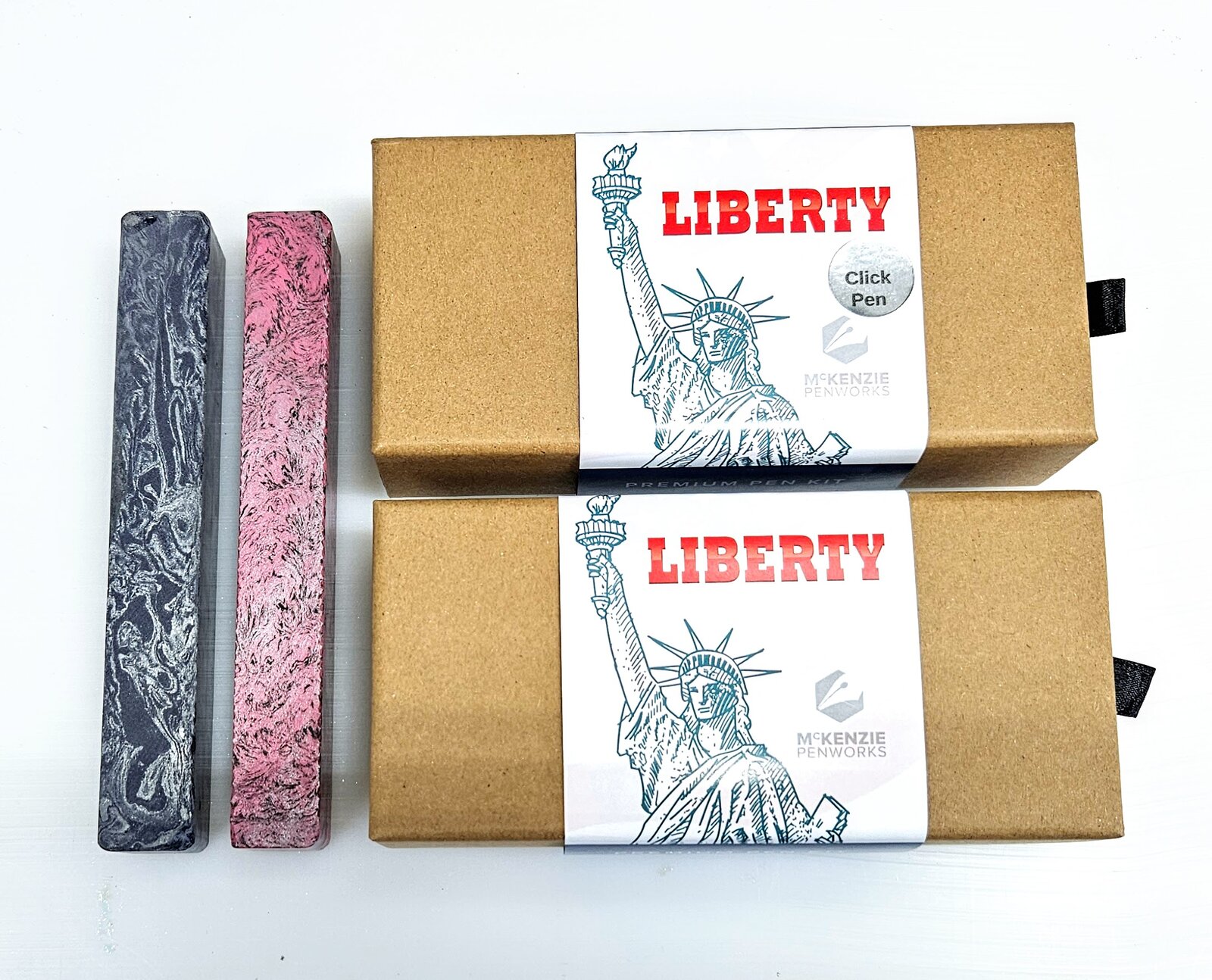 $75 Value Box: 1 Liberty Twist Pen Kit w/Box ($21.75), 1 Liberty Click Pen Kit w/Box ($21.75), 1 Blue/Silver M3 Blank ($20), 1 Pink/Black M3 Blank ($20)