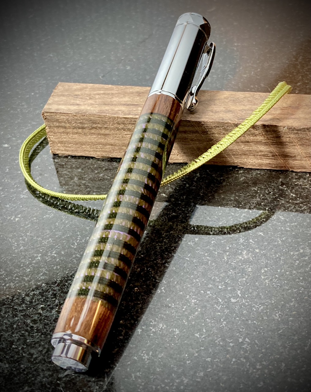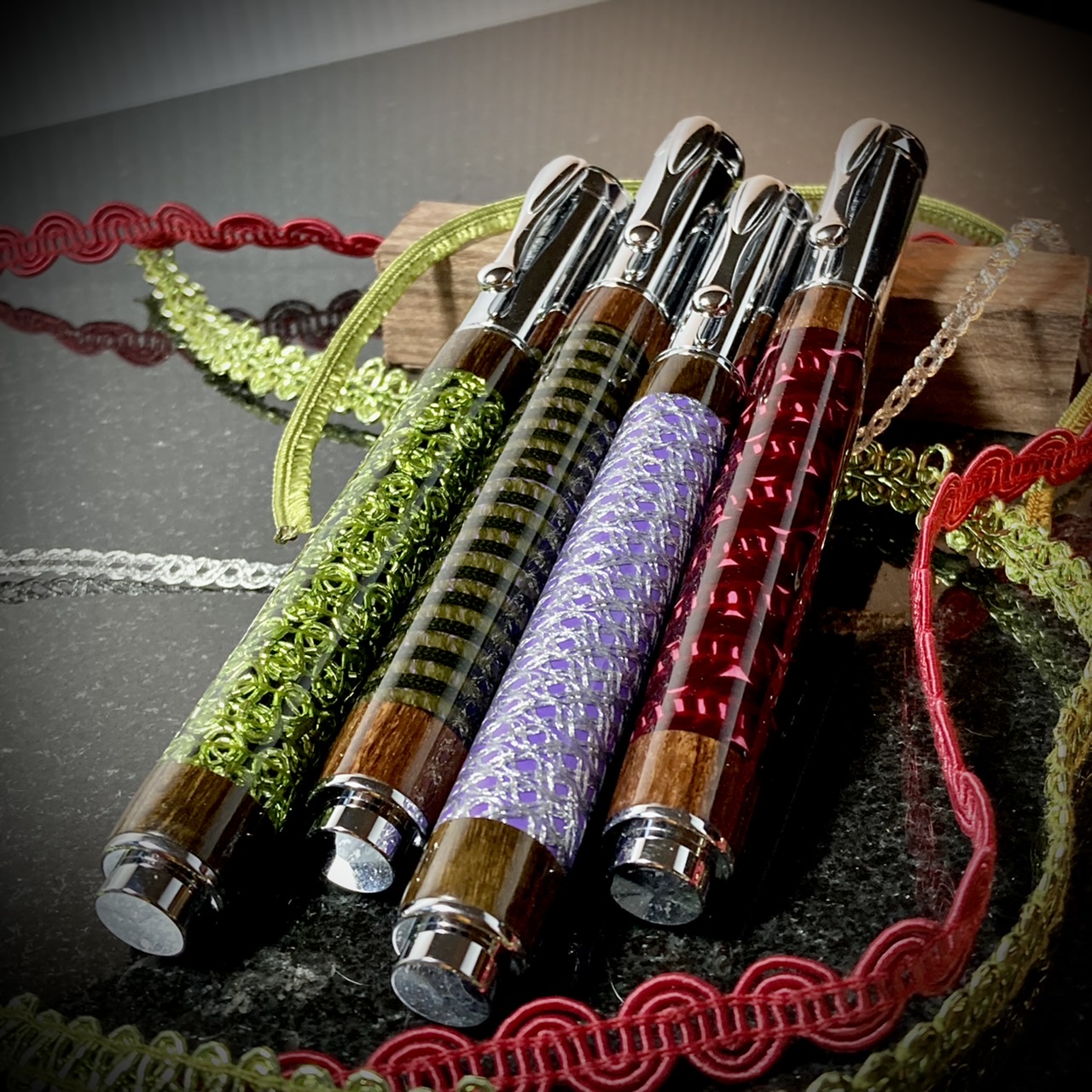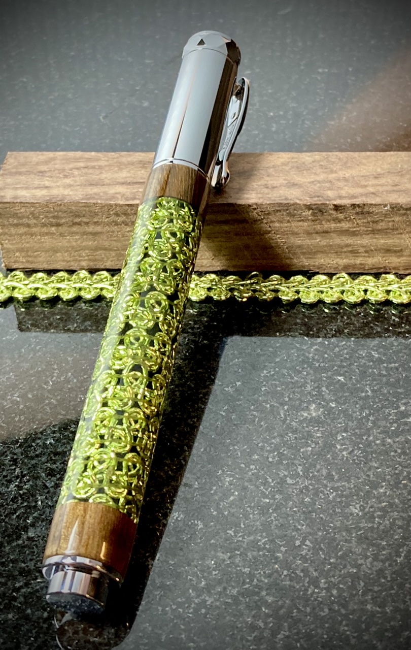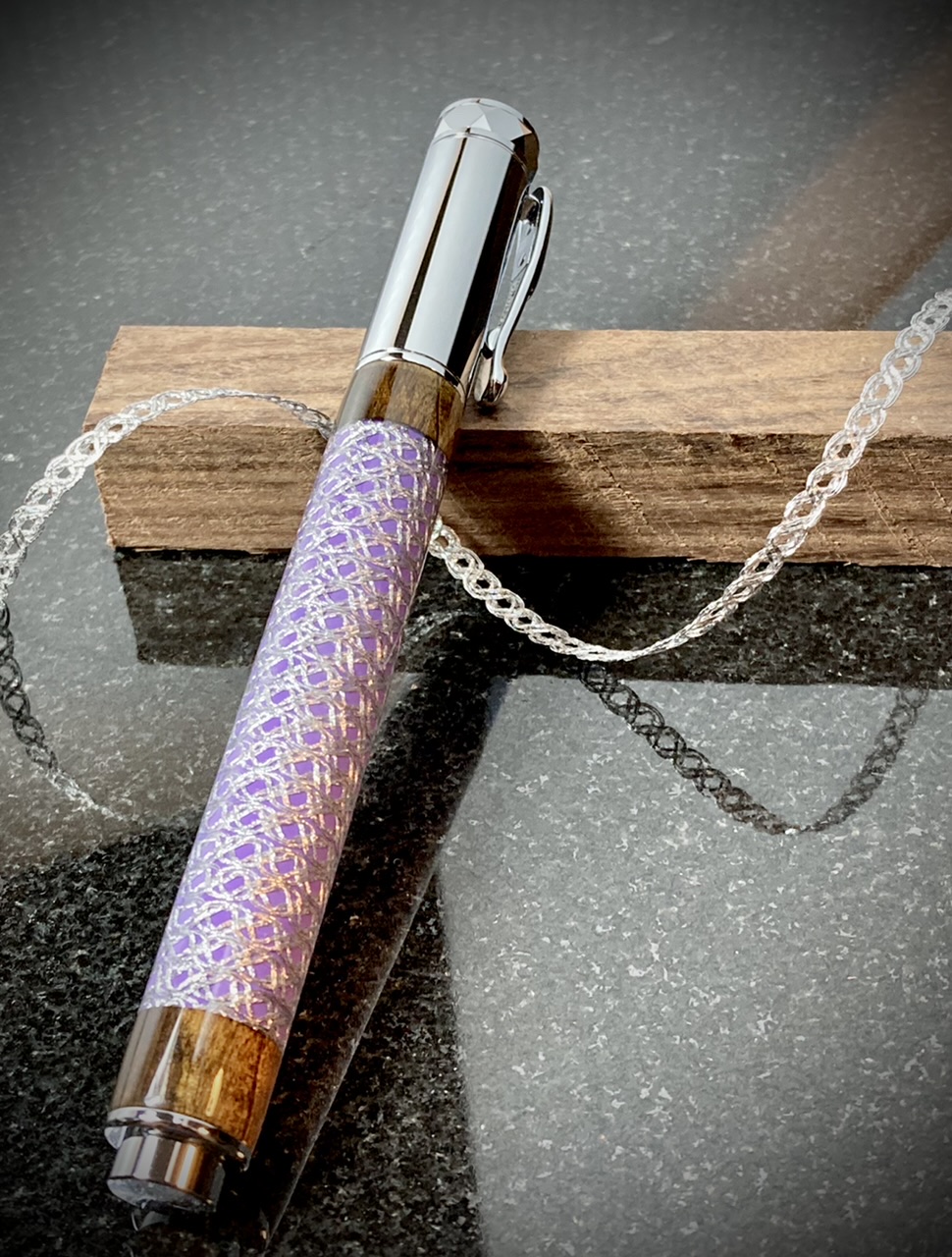 I painted the tubes a contrasting color and let it dry. I lined a dowel with wax paper and used tape to secure the starting end of the ribbon to the dowel. The painted tube fits onto the dowel over the wax paper which prevents accidentally gluing the dowel into the tube. On the other end I tied a weight to the ribbon to keep things taught. Then coated the tube with 5 min epoxy, on the thick side, and then carefully twisted the dowel to wind on the ribbon. I went all the way past the other end of the tube and clamped the dowel in my vice to set up.