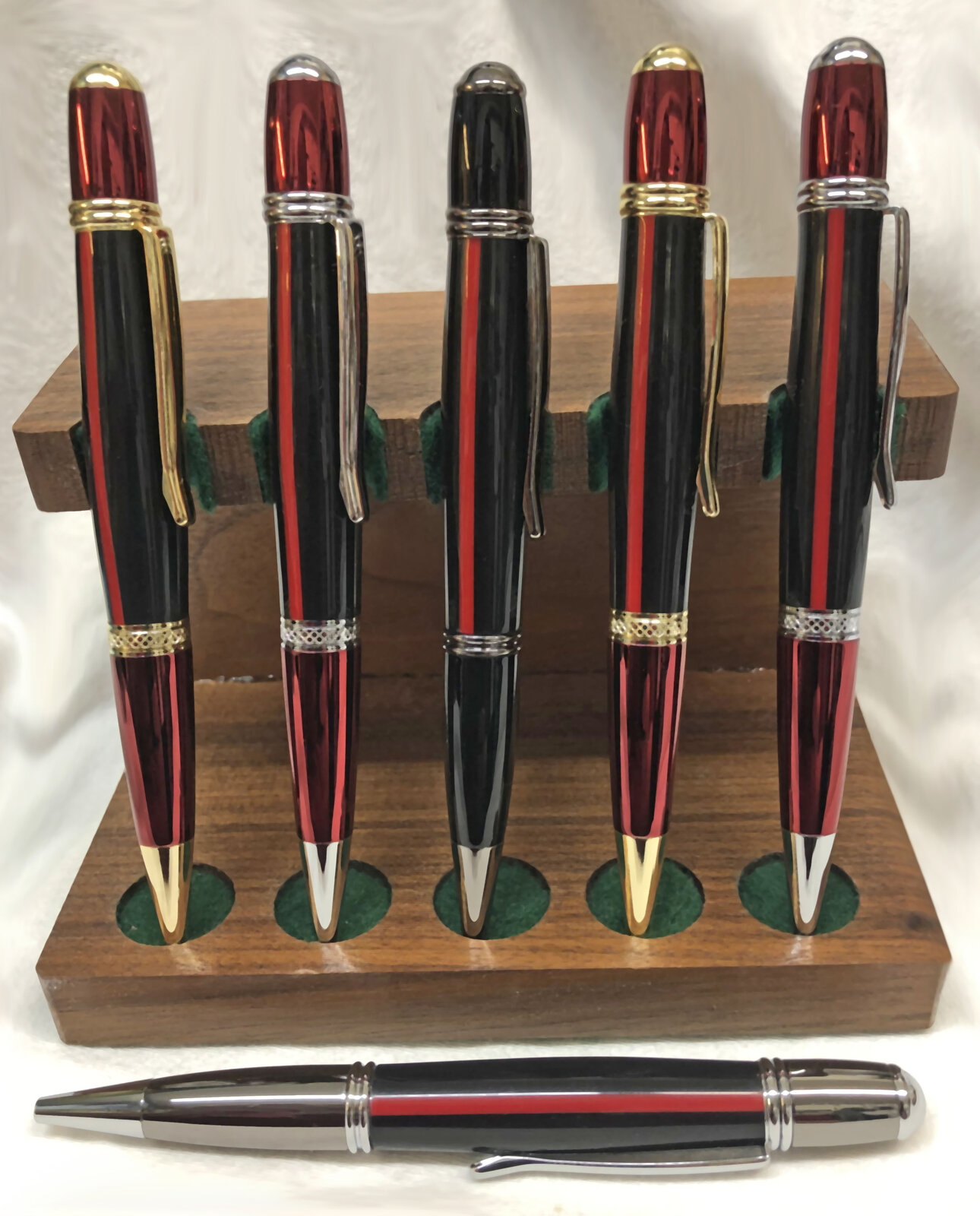 I made another batch of six Thin Red Line pens using red/gold and red/chrome Prism kits from Exotic Blanks and a couple of gunmetal / chrome-gunmetal kits that I had on hand. The first batch was made using blanks that were gifted from Earl McLain (greenacres2). This batch was made with Alumilite blanks from Turner's Warehouse. Unlike the first batch which were poly resin, they drilled and turned like a dream and didn't have the strong poly resin odor when being worked.
