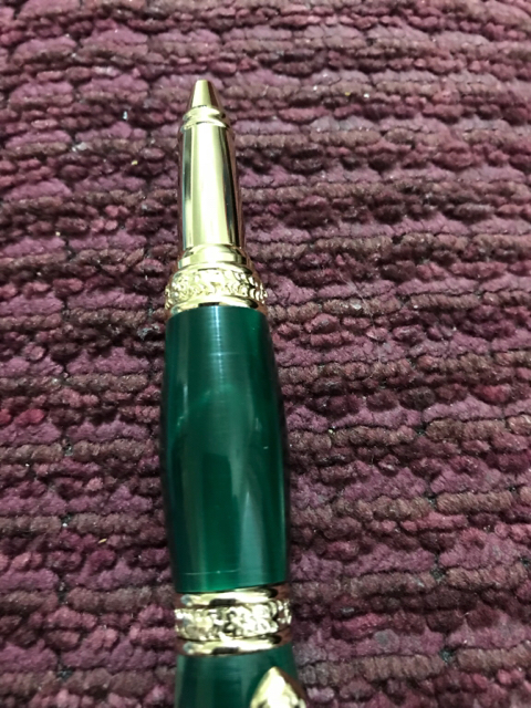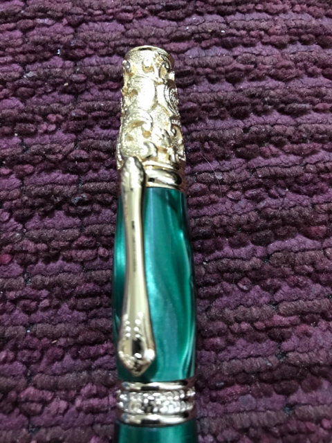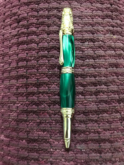 I turned this pen for my mom for Mother's Day. The blank is kirinite green pearl in a Victorian 24kt Gold Twist pen kit. This is just my second non-wood pen, so I'm very new to this hobby.