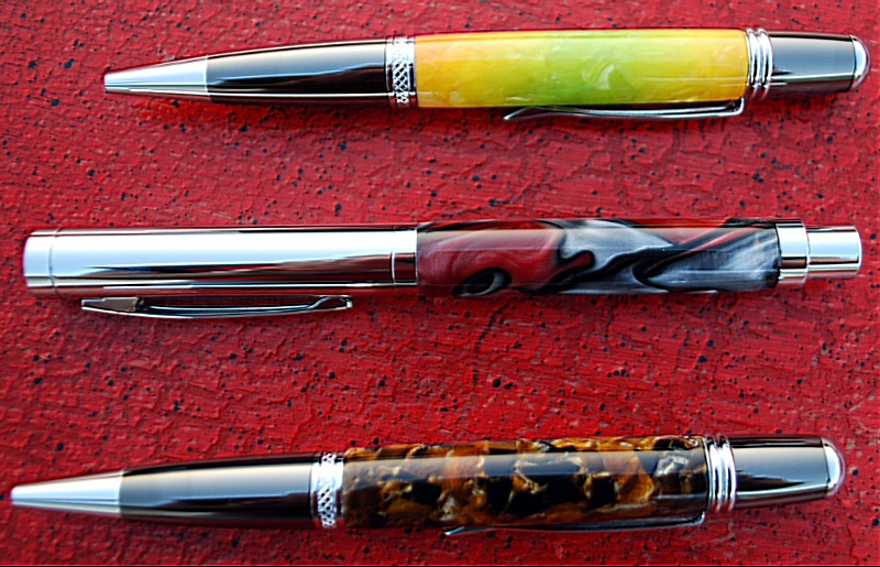 My wife wanted me to make her mom and sister a pen, and she picked out the blanks/kits. The top and bottom pens are the ones she picked out for them. I have been wanting to try a Manhattan kit, and my wife was admiring the red/black/white acrylic, so I made her one too.
