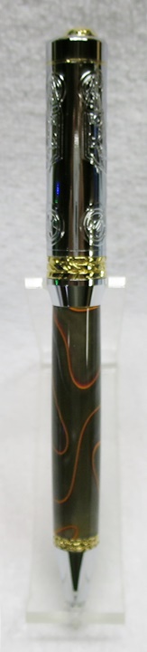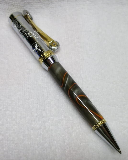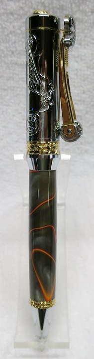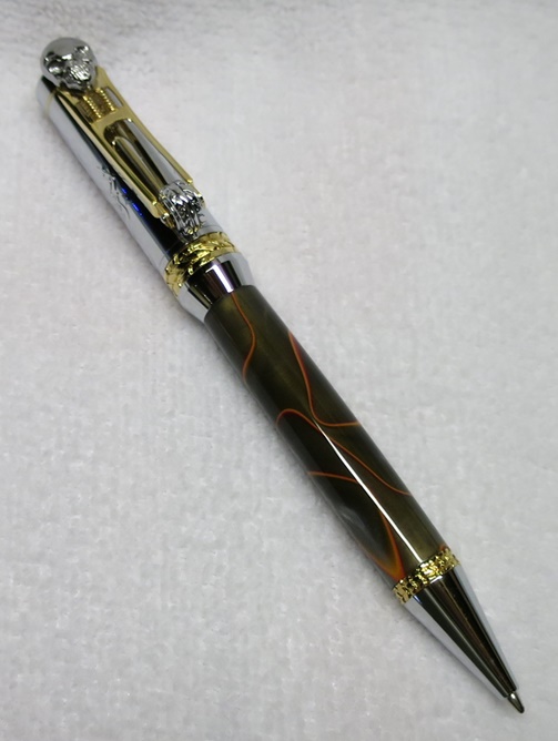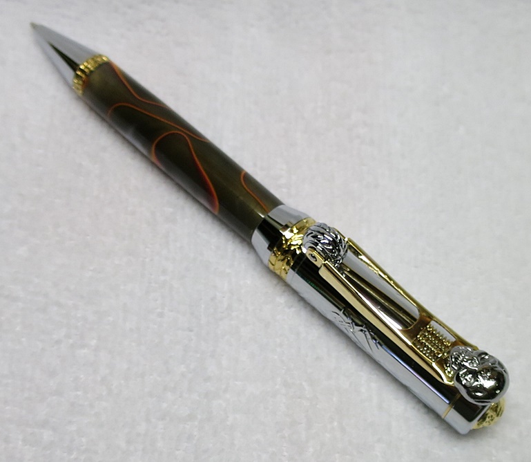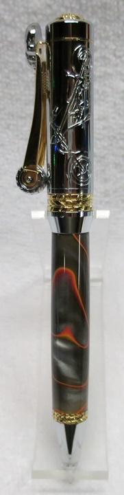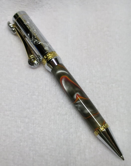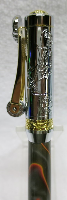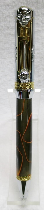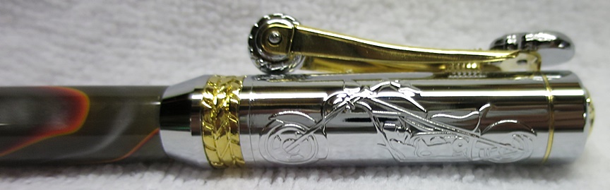 My first Motorcycle Pen. The blank is called Midnight Racer. I made this for my barber, Frank's, 70th birthday. He's been riding Harleys since he was a teenager. I do wish I had painted the tube black.