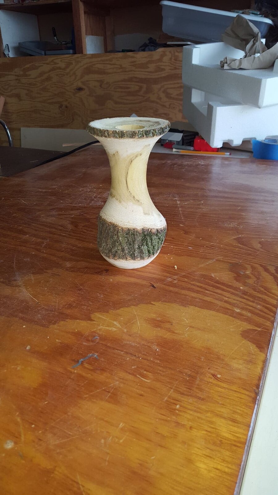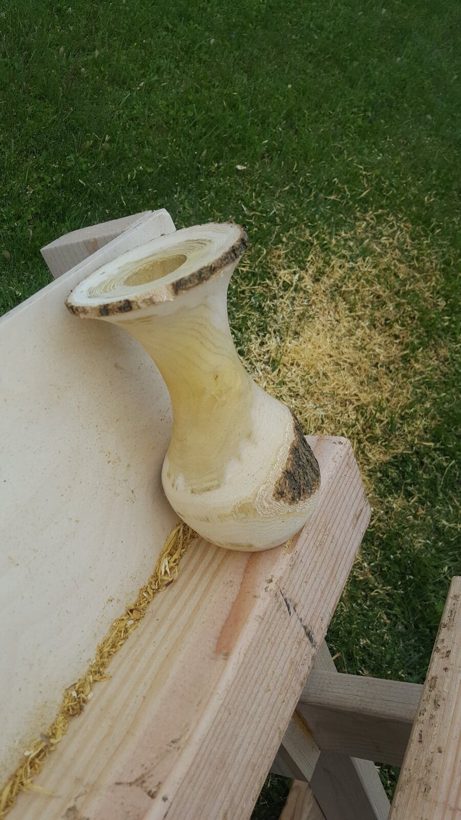 This wood works nice when it is green. I've never turned it before. I'll be getting more of this over the spring and summer. I'll actually try to dry them out and make some bowl blanks. This piece was straight from a green log. They call them Rustic Vases? Suppose to put dry flowers or artificial flowers in them. This should crack a bit as it dries... part of the charm of a 'Rustic Vase.'