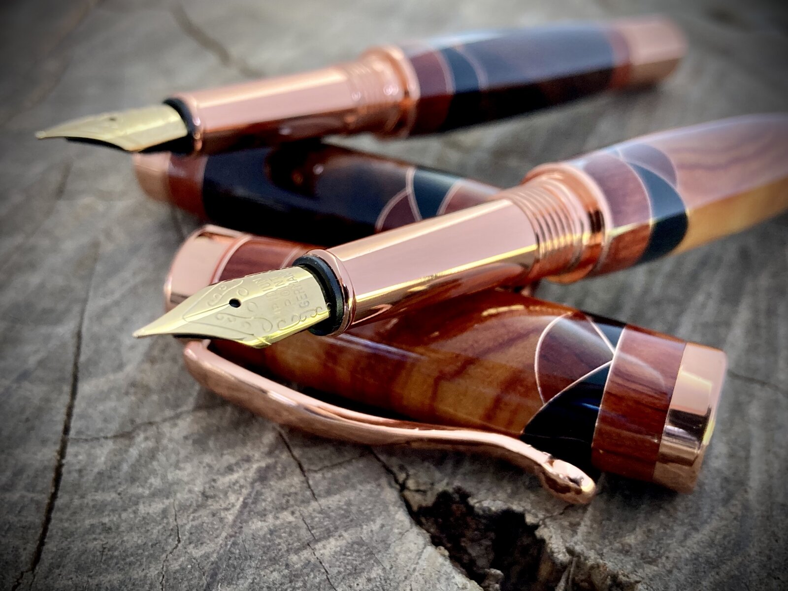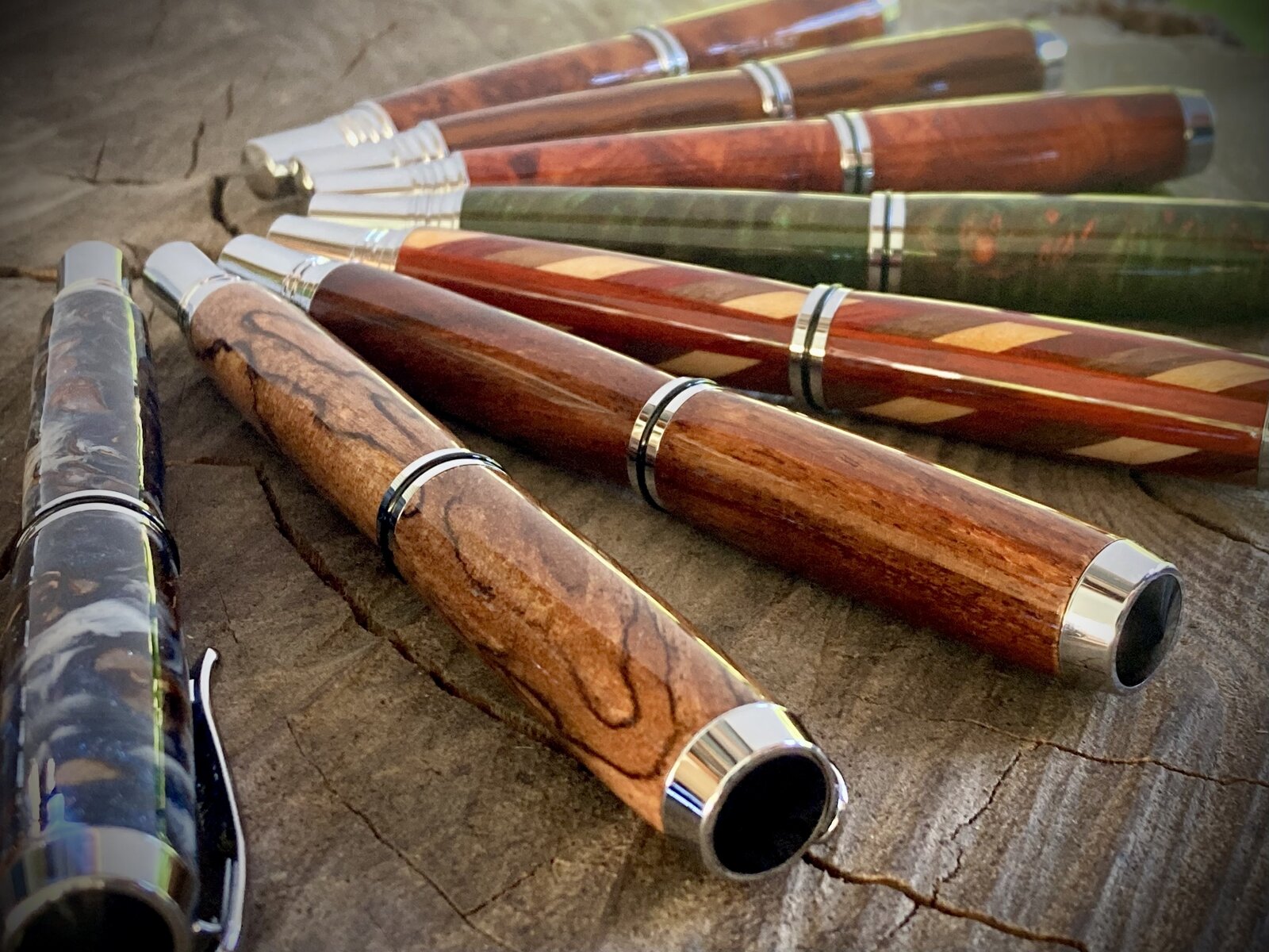 My thoughts are that you should use a more classic background, not the tree stump. The pens are beautiful, but the stump takes away from the pens class.