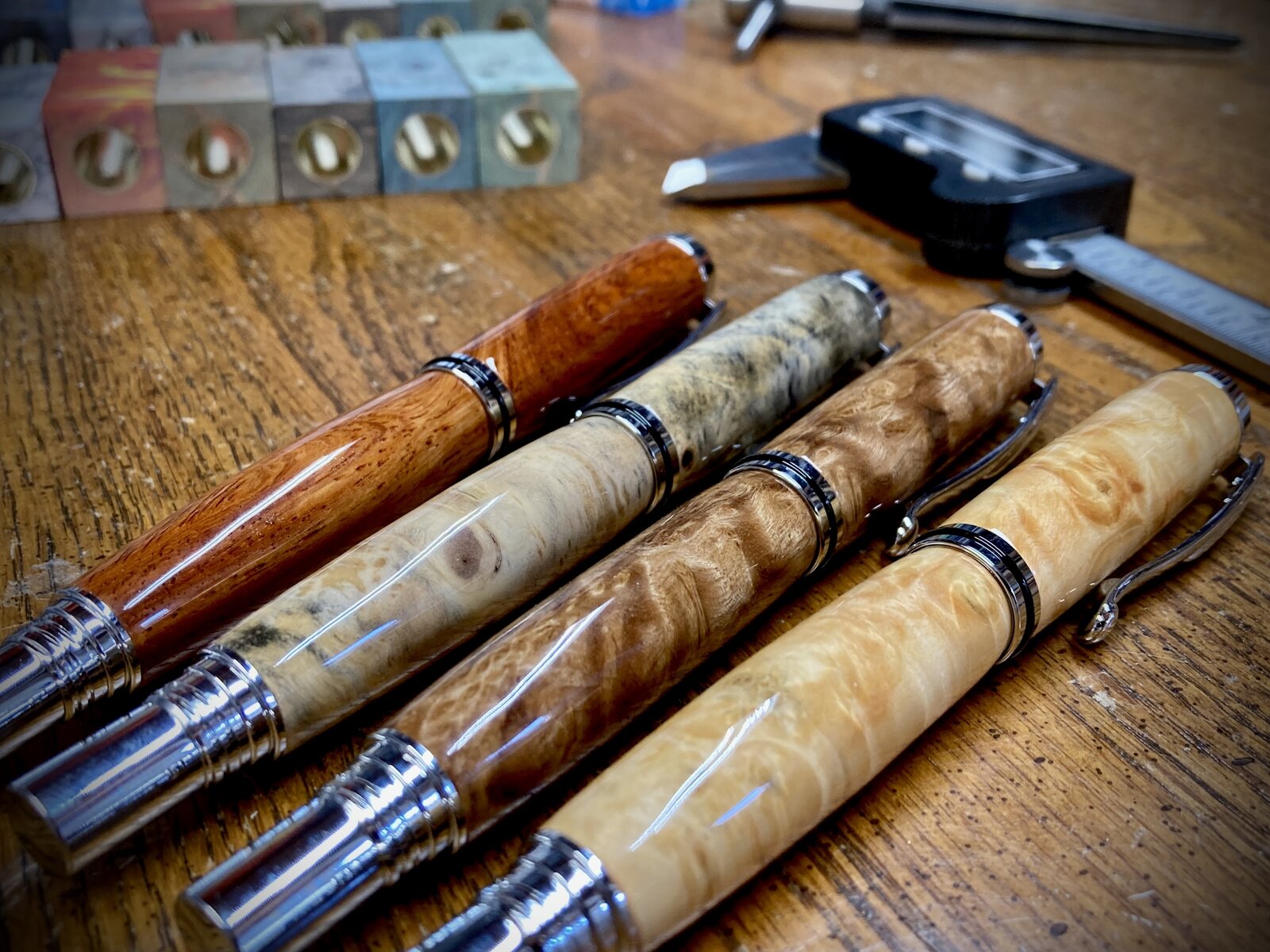 For reference, comment, and criticism, and here are the photos I have been submitting this year. All of these were pens made in 2024, and none of them are the same as previously submitted last year. One does include multiple pens and was taken on my workbench with some pens in progress in the background. Compositionally, this one is the best I've come up with to show multiple pens, pens in progress, and the element that these are handmade items.