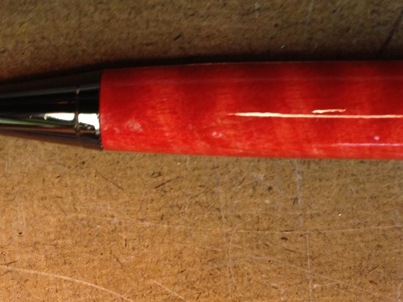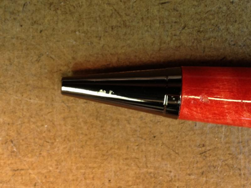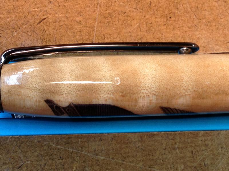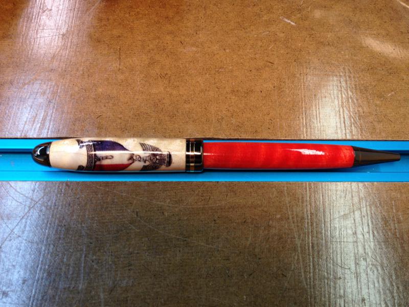 First, I've never done a decal pen. Good place to start. Then, I was inspired by some work done by Rick (rherrell) who, ever the gentleman (and a GREAT vendor, I must say) was kind enough to coach me on staining a blank after I sent him an email about his beautiful MagLite modification. So, after the turning, decaling - couple of failures along the way until I discovered that the decal needs FOUR shots of acrylic spray - at least the way I do it - got the whole thing turned, coated in multiple coats of CA, and assembled on a pen. I truly think it's one of the nicest I've done. Even SWMBO, my greatest critic, an artist herself, and one who can be trusted to find the smallest flaw (I mean that in a good way), found it perfect. Only thing left is to photograph it for my collection. No problem. Took it outside, put it on a piece of foam core board that I normally use, put the pen on it, rested it on the BBQ grill on my deck, and turned around to put down another pen I wanted to photograph. Along came a puff of wind. Lifted up the foam core and pen, sent them sailing, the pen hit the handrail for the steps up to the deck, deflected down onto the cement pad on the bottom, and made a couple of "ding" sounds. I'm nearly heartbroken. BOTH blanks have significant dings. Hopefully, I'll be able to salvage the upper one with the decal. The lower blank has dings into the wood, so I may have to turn, stain, and finish another. Hardware took some hits, too. I thought I had a bunch of those kits extra but, fortunately, I do have ONE left. Guess what I'm ordering again tonight?