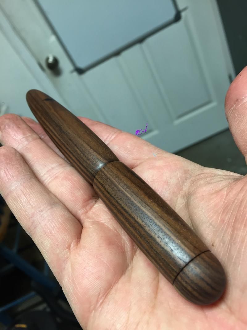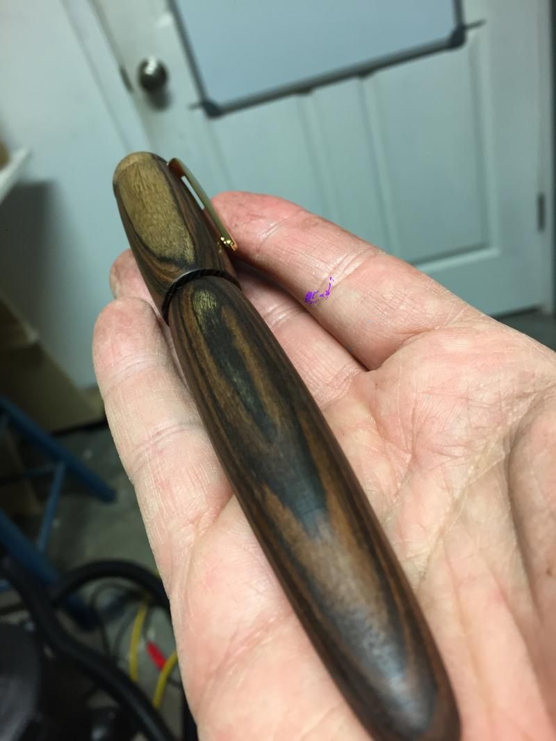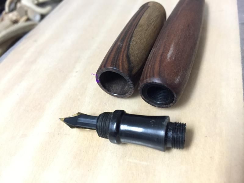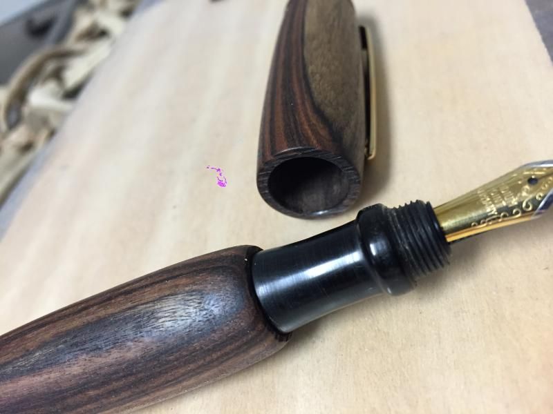 Unknown wood and ebonite. My daughter said it must be turd wood. I guess cause it looks similar. The clip was repurposed from an Olympian elite. I started with a leftover nib that wasn't doing a good job and replaced it with a Bock. I watched a YouTube video on masters of the pen series about a Japanese maker who put the cap threads below the nib, and wanted to try it. I used tung oil as a finish