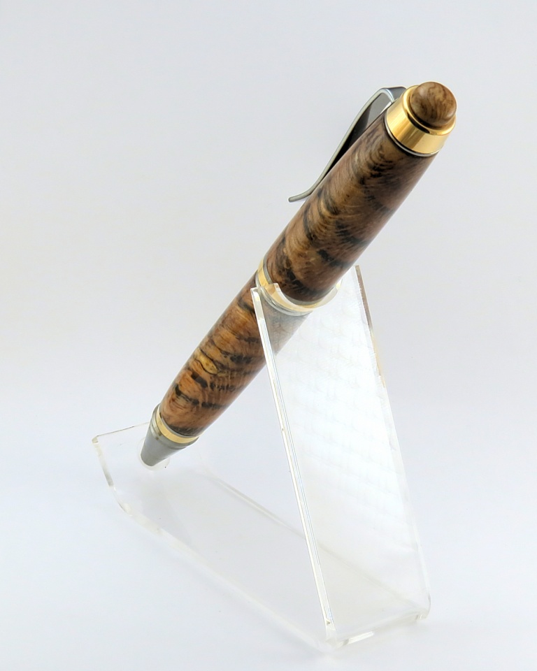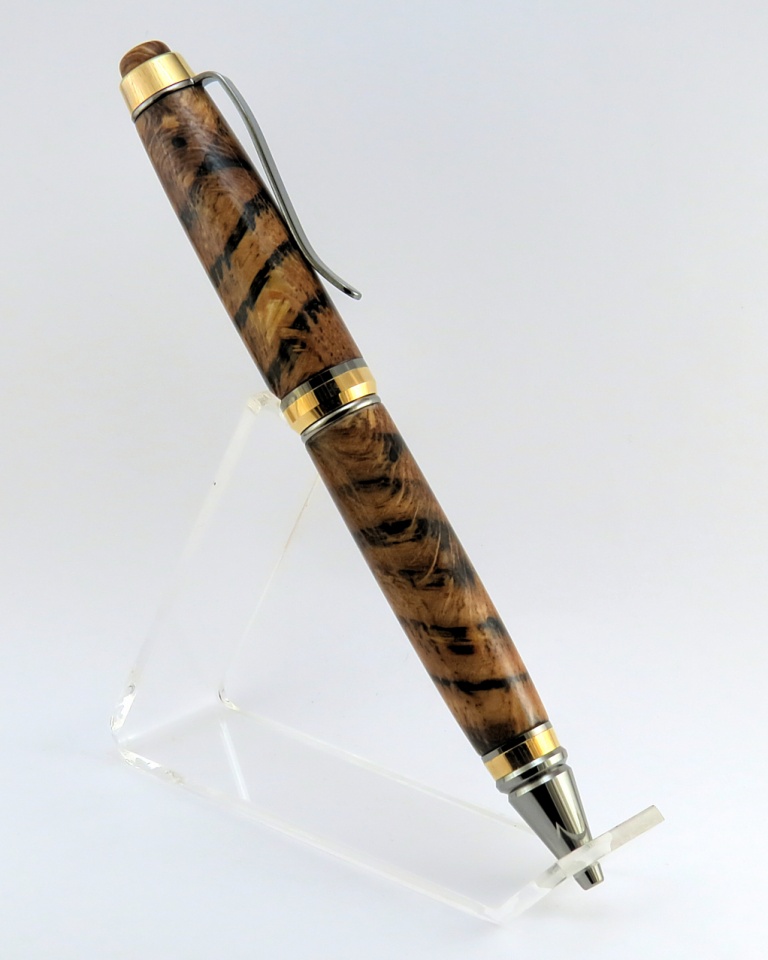 Black Ti/Gold Ti Cigar with Spalted Red Oak. The only modification to this pen is the custom finial. I don't really care for the hex finial, but I like the rest of the kit, so the best mod for me is replacing the hex finial with a wooden one! The barrels were soaked in BLO for a day and then left dry for an equal amount of time before I applied the CA finish. The BLO soak really gives the oak a rich, golden look. The second pic especially looks kinda like an airplane - it just needs wings. :biggrin: