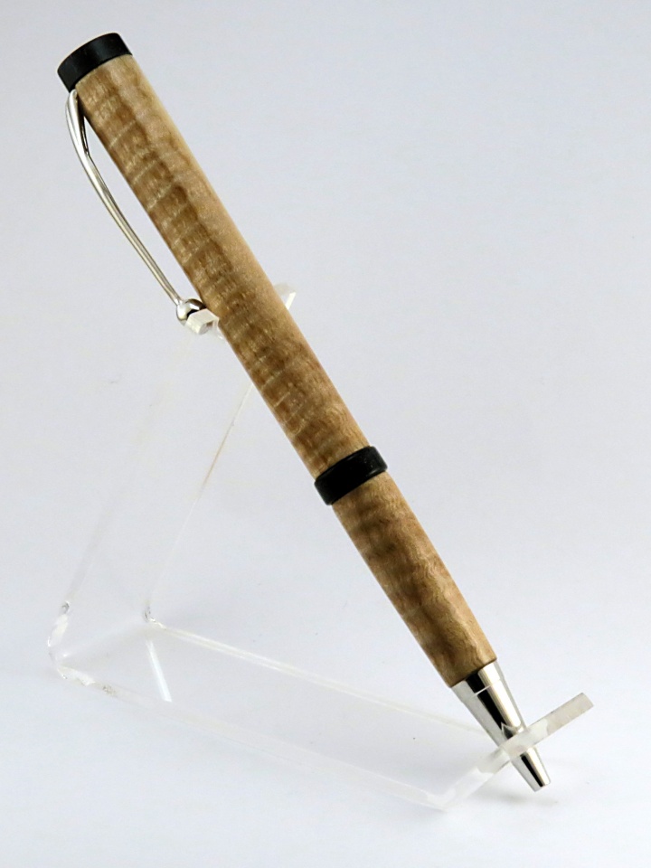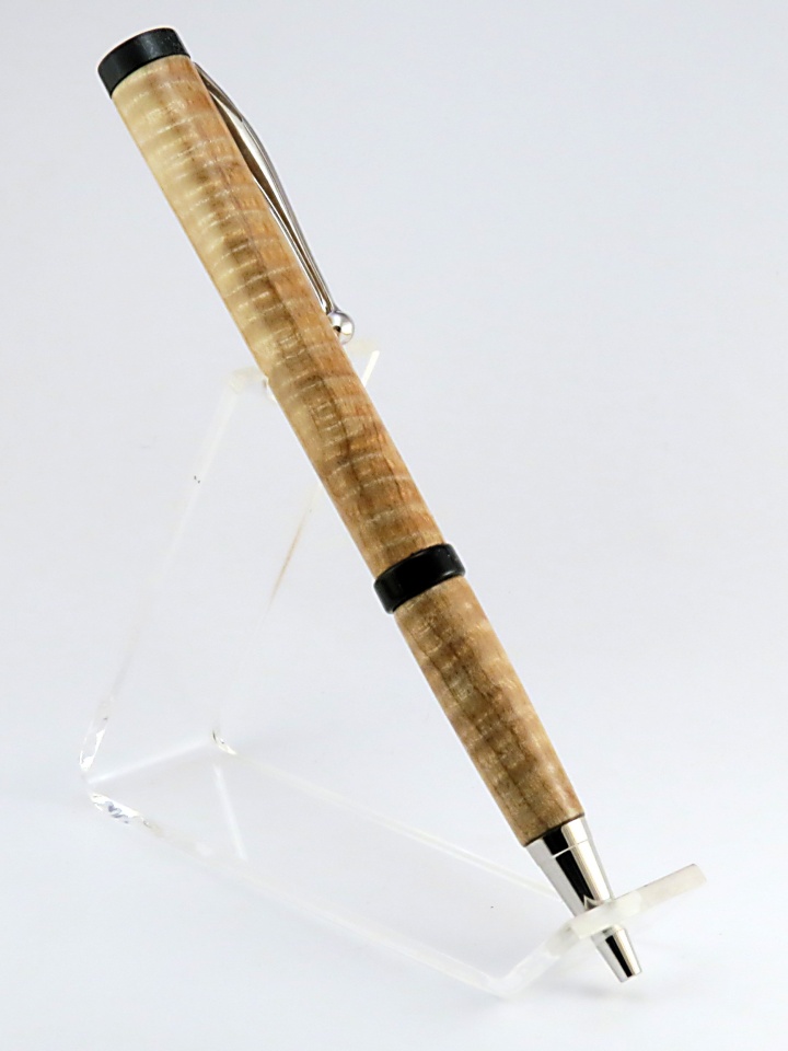 Curly maple, with sparkly black acrylic for the centerband and finial.