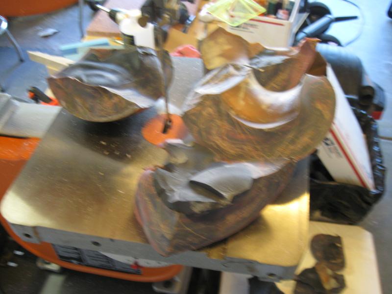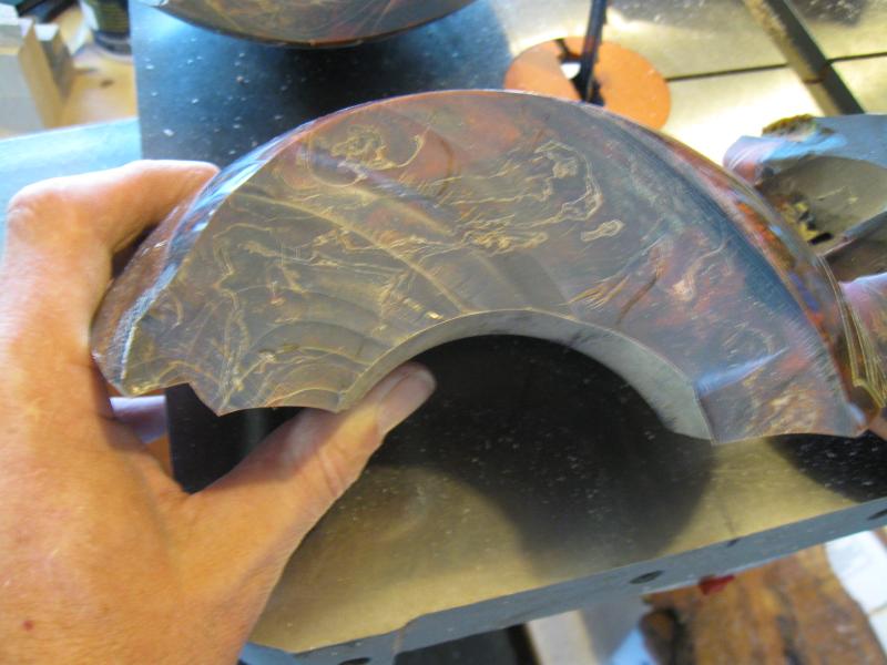 Well as I mentioned in another post I was going to attempt to cut a bowling ball. No riser on the bandsaw so that was out but I did find something that worked my little battery powered circular saw. I was able to cut to the depth needed and then with a hammed and small prybar I split it and got some nice large, thick pieces as you can see below. I was able to cut the center stuff easily in the pieces and got a couple of blanks out of it but more on the way. More pics to come.