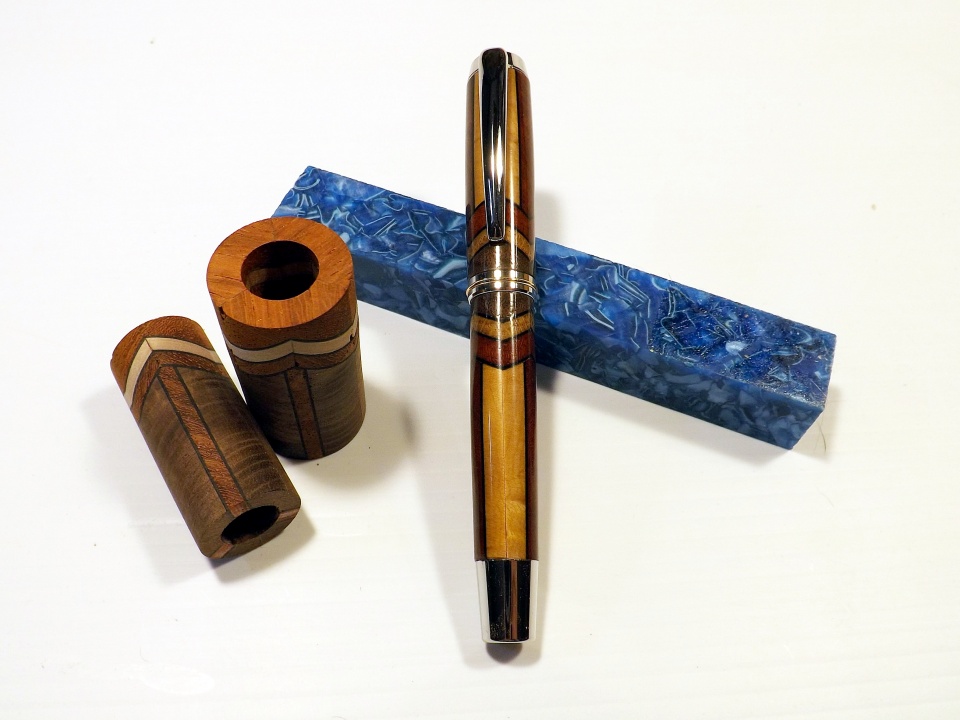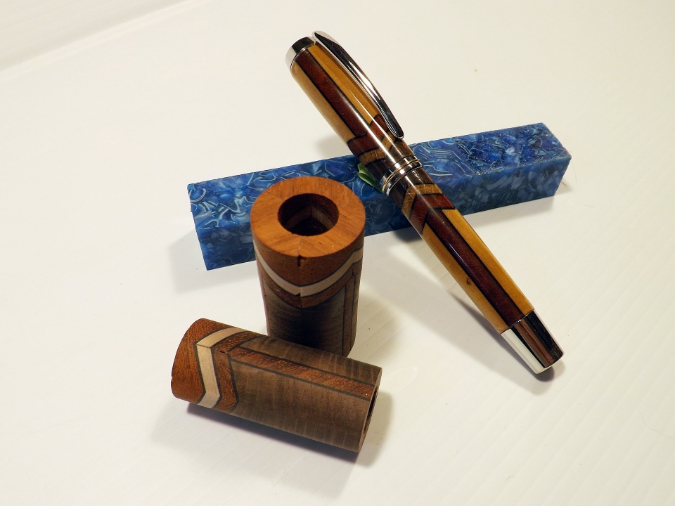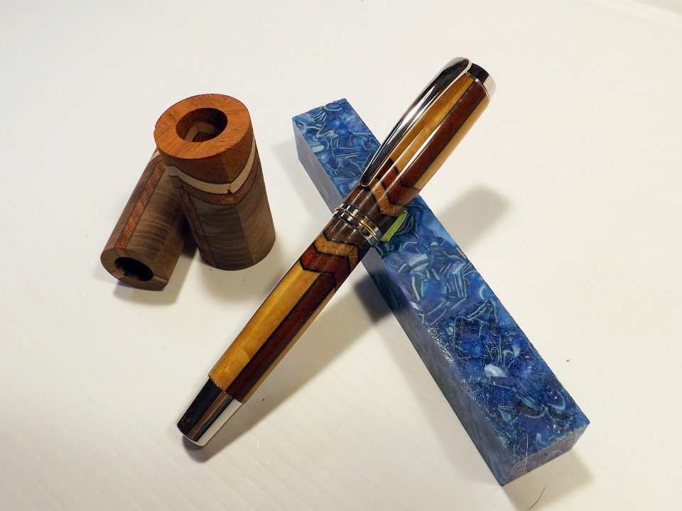 A Gisi style pen that I put together for the Segmented Contest, there is a little twist on the pattern as it's three sided instead of going all the way through. The wood is walnut, maple and padauk. Fun project failed miserably, but still fun lol.