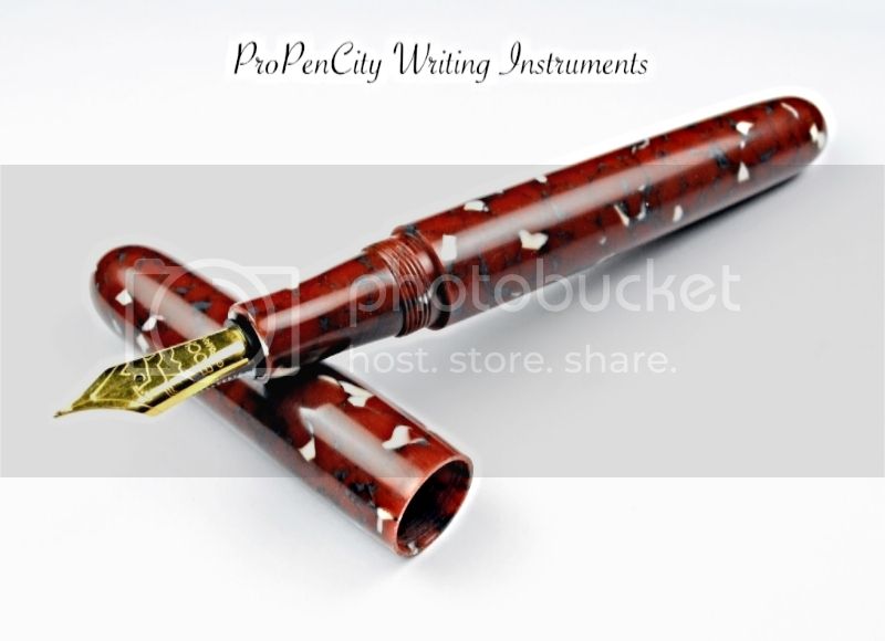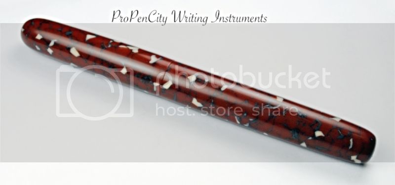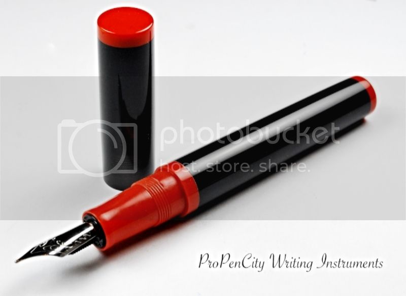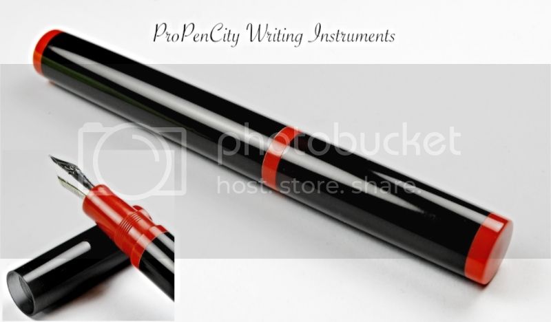 Acrylic Black with Orange segments with Jowo #6. I used 10mm tap/die to join the segments to the body, 14mm tap/die for cap to barrel. I prefer the straight lines and flush join between cap and barrel. A shorter pen measuring 5.25 inches when capped.