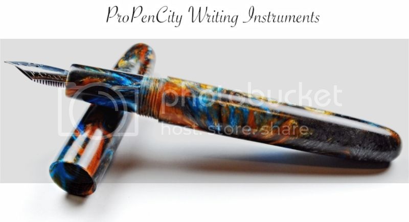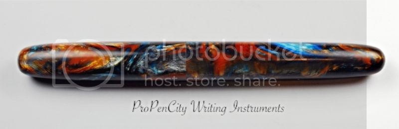 Lava Explosion with Jowo #6, blank from Exotic Blanks. A bigger pen at 6 inches when capped, I used 15mm tap/die for cap to barrel. Not Postable. Beautiful blank with swirls of blue, orange, black, grey.