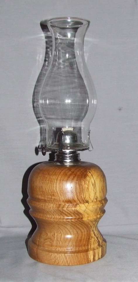 The little vase is just over 7 1/2 inches tall. The lamp is white oak and has the glass oil reservoir buried in the turning. It's about 16" over all height.