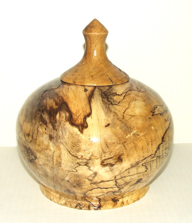 The lidded hollow form is about 7 1/2" dia by 9 inches overall height with the lid. Finish is polyurethane.