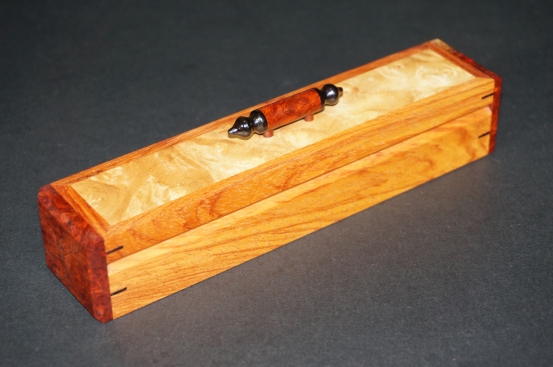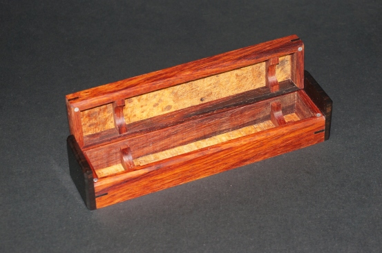 I want things right before I start on the Dayacom pens. I designed the boxes to fit the different Dayacom kits I've chosen to make. Each box has two cross beams with a half moon cutout to suit each different pen and not touch the wood. I placed tiny barrel magnets in the lids and bottoms to keep them closed which seems to work well.