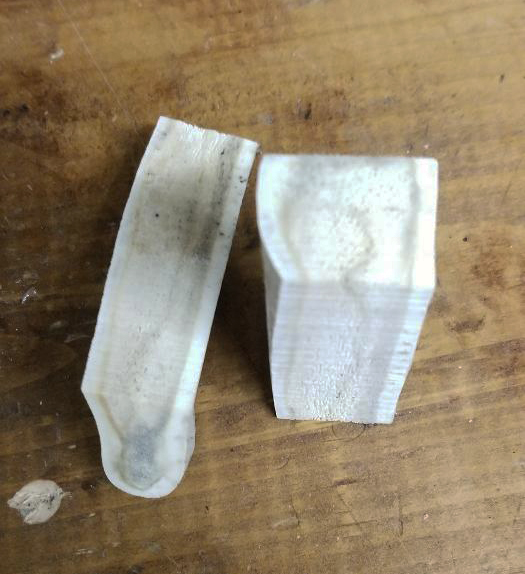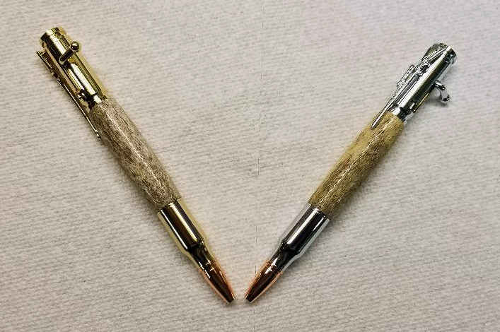 I got a free box of wood a while back at a gun show. It had this one piece of bone in it also. There is a pic of it below also and not sure what the bone is from. Anyway, below are two bolt action pens. I decided not to fill the porous sides to them and just leave them natural. I finished them by sanding from 150 grit to MM 12,000 grit. I then put a few coats of Renaissance wax on them. I like the natural feel of the bone.