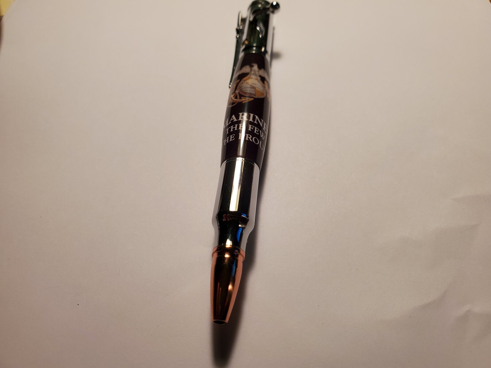 This is my first attempt at label casting (and my 5th pen overall). Next time I'll use calipers to check the ends instead of relying on the bushings. Also, I'll probably go for a straight barrel instead of the bulge. The pen is thicker than I thought it would be. The real problem though is the label itself. I printed it on waterproof matte paper from Onlinelabels.com. The background was black when I wrapped the tube, but it's now brown. I cast it in Alumilite Clear and let it cure in a pressure pot overnight. Any idea what would cause the color to change like that?