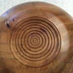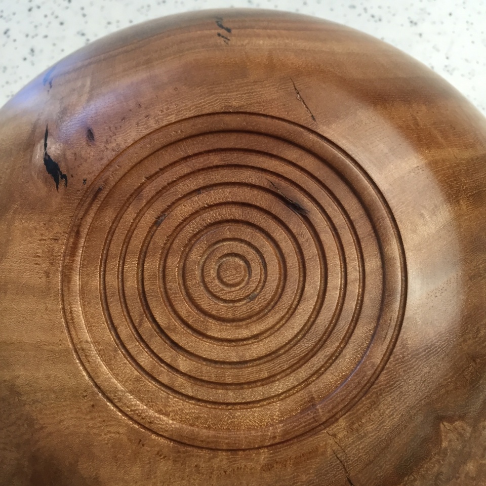 I dropped in at the local Heritage and Art Gallery and found a turner was there with his very beautiful work. He is only there once a month, and lives in another town. (As Leroy Jethro Gibbs' Rule 39 states: There is no such thing as coincidence.) I told him I would love to learn how to turn bowls, and he invited me to come to his house and give it a try. He gave me an Elm block, attached it to his lathe and walked me through the process. We turned it but didn't remove the tenon and take care of the bottom, so it wasn't finished.