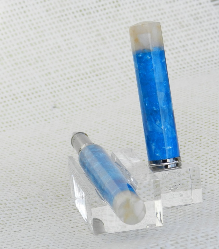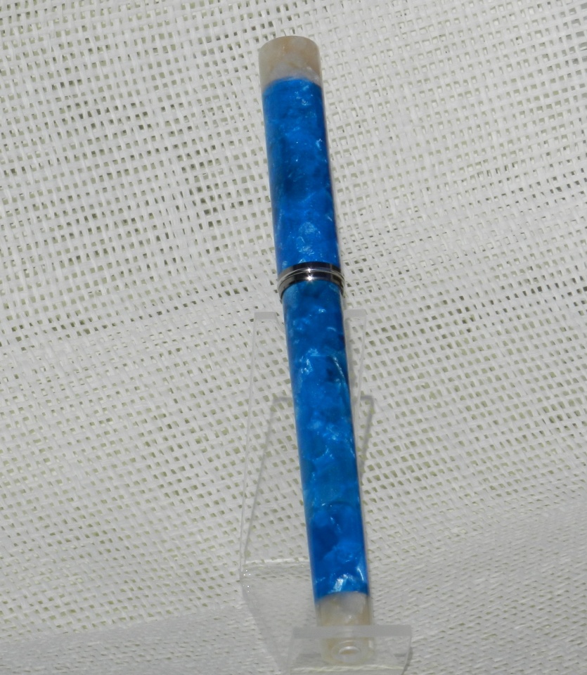 Here's my first attempt at a closed end pen. The body wasn't long enough after cutting the portion for the cap, so I improvised and added the white chip resin on the ends.