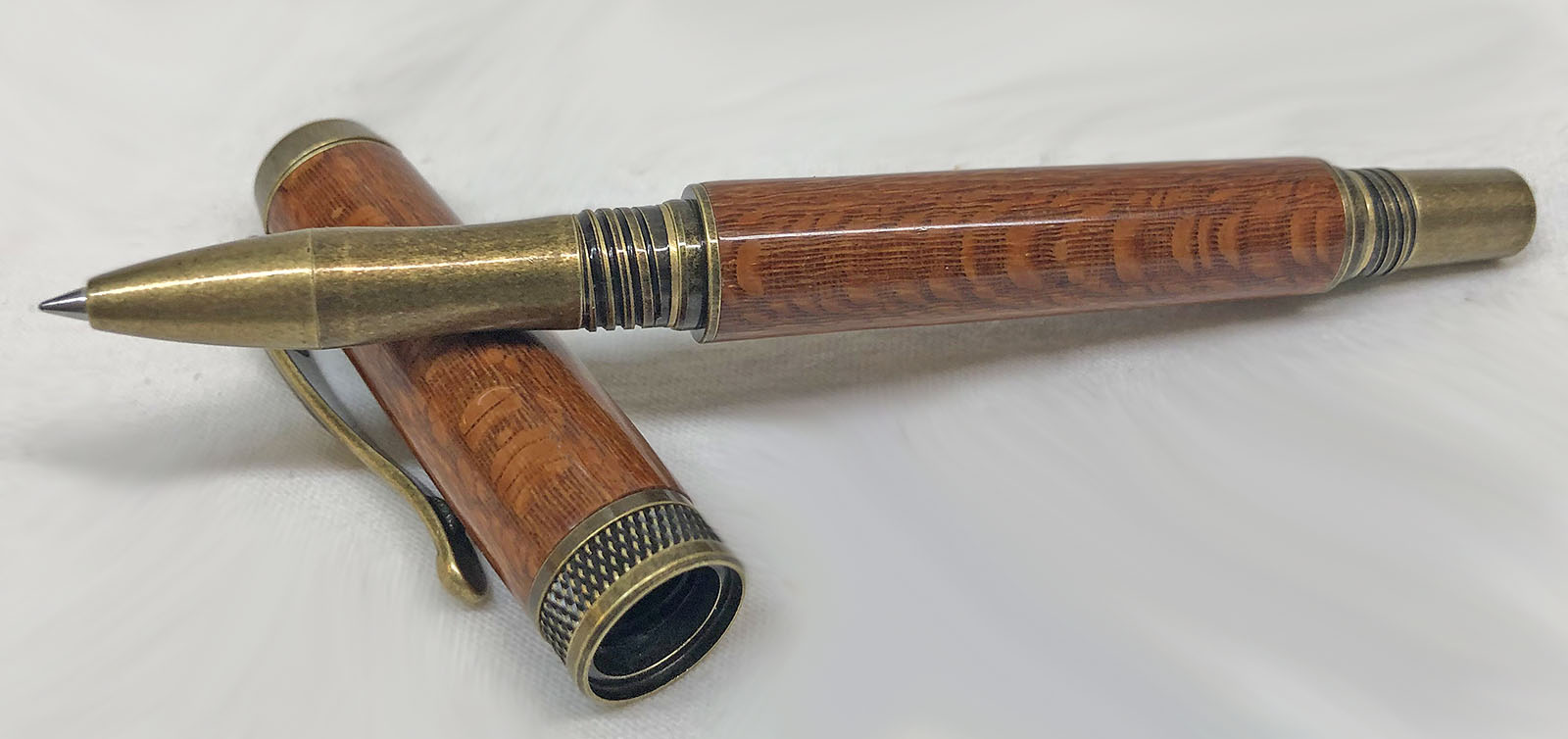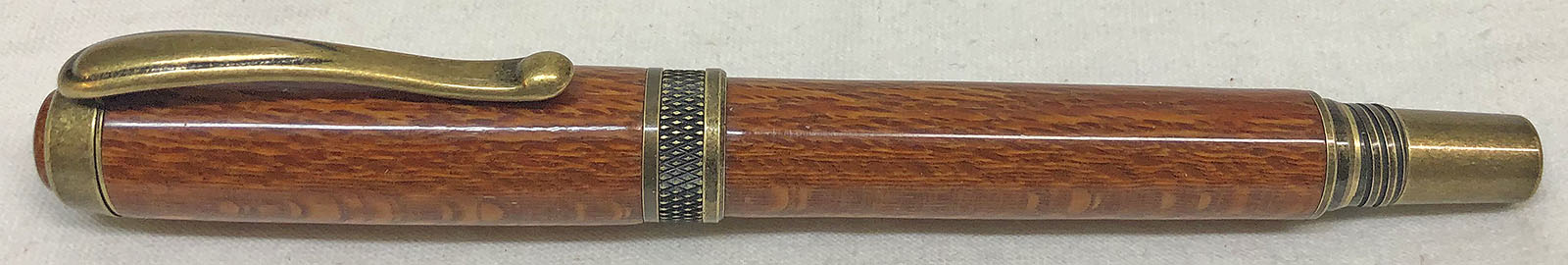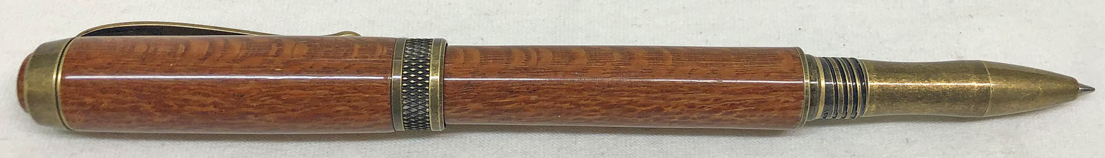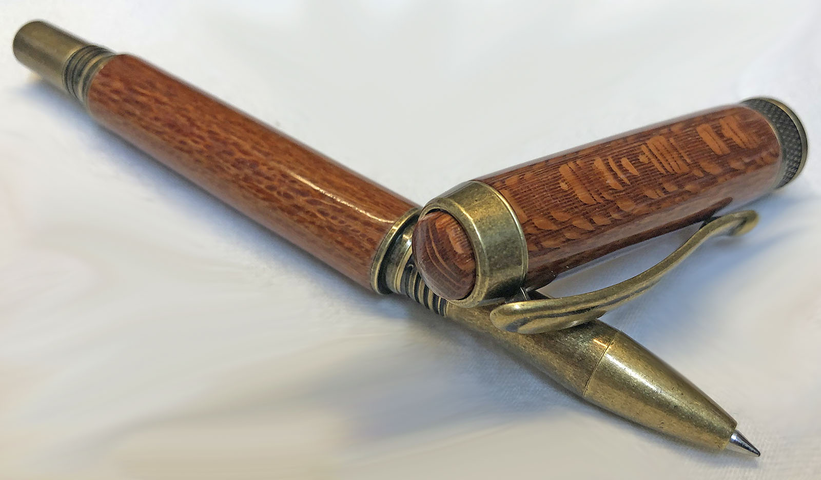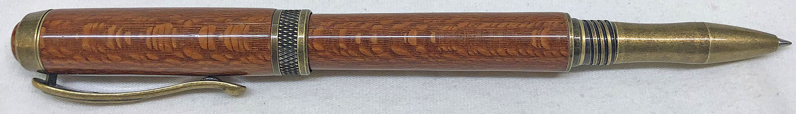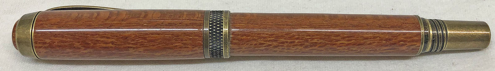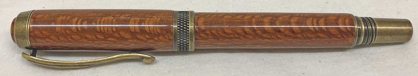 Today I finished up the custom cabochon for my first Diamond Knurl from Ed and Dawn at Exotic Blanks. It is their Antique Brass finish and I used Brazilian Lacewood finished using my standard CA regimen. Smitty's Caballero (also from Exotic Blanks) used to be my favorite Junior Gent style, but I think the Diamond Knurl might be taking over the top spot. I really like the rustic feel that the knurled trim ring gives to the pen.