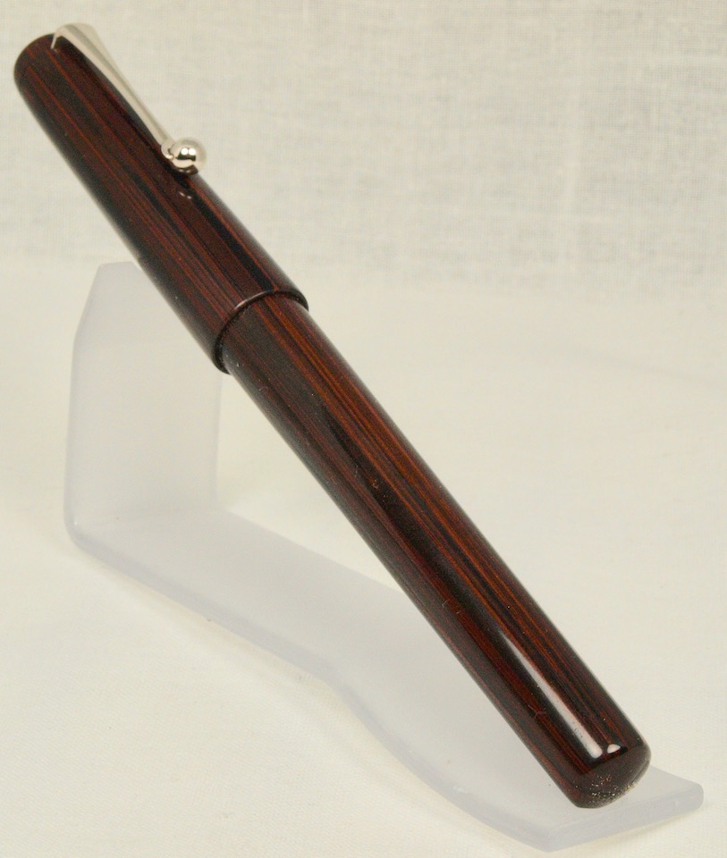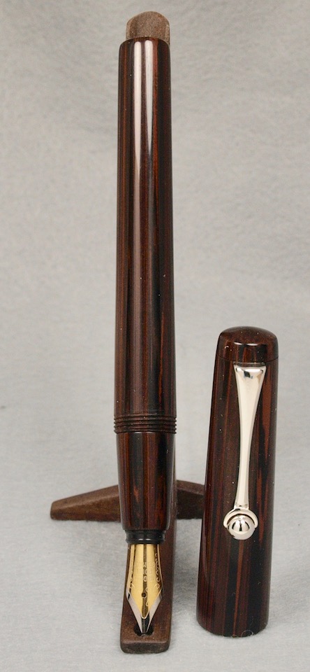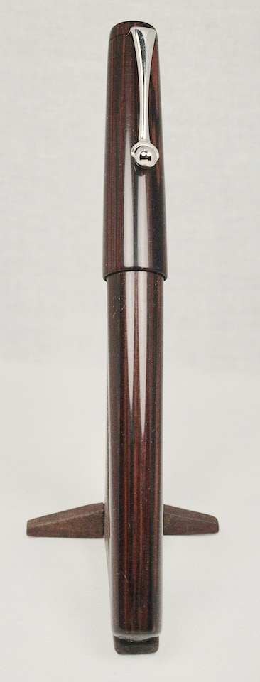 This is my first work with ebonite. I wanted a simple design as another EDC. I see there are still scratches on it, I have to work on my sanding and polishing, I learned that ebonite likes rounded HSS not pointed or carbide tools. I got a better finish from a tool with a large tip radius. The pen is 5.495 inches long capped, 4.815 in uncapped. The pen body is 1/2 in diameter with a single start thread.