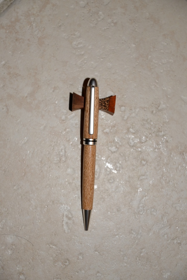 Hello! This is my first attempt at a European Style pen and only about my 10th pen to date. The first 9 were all slimline pens. This one is done in a lacewood maple. It was very nice wood to work with and I even cut a tendon. I was happy with it.