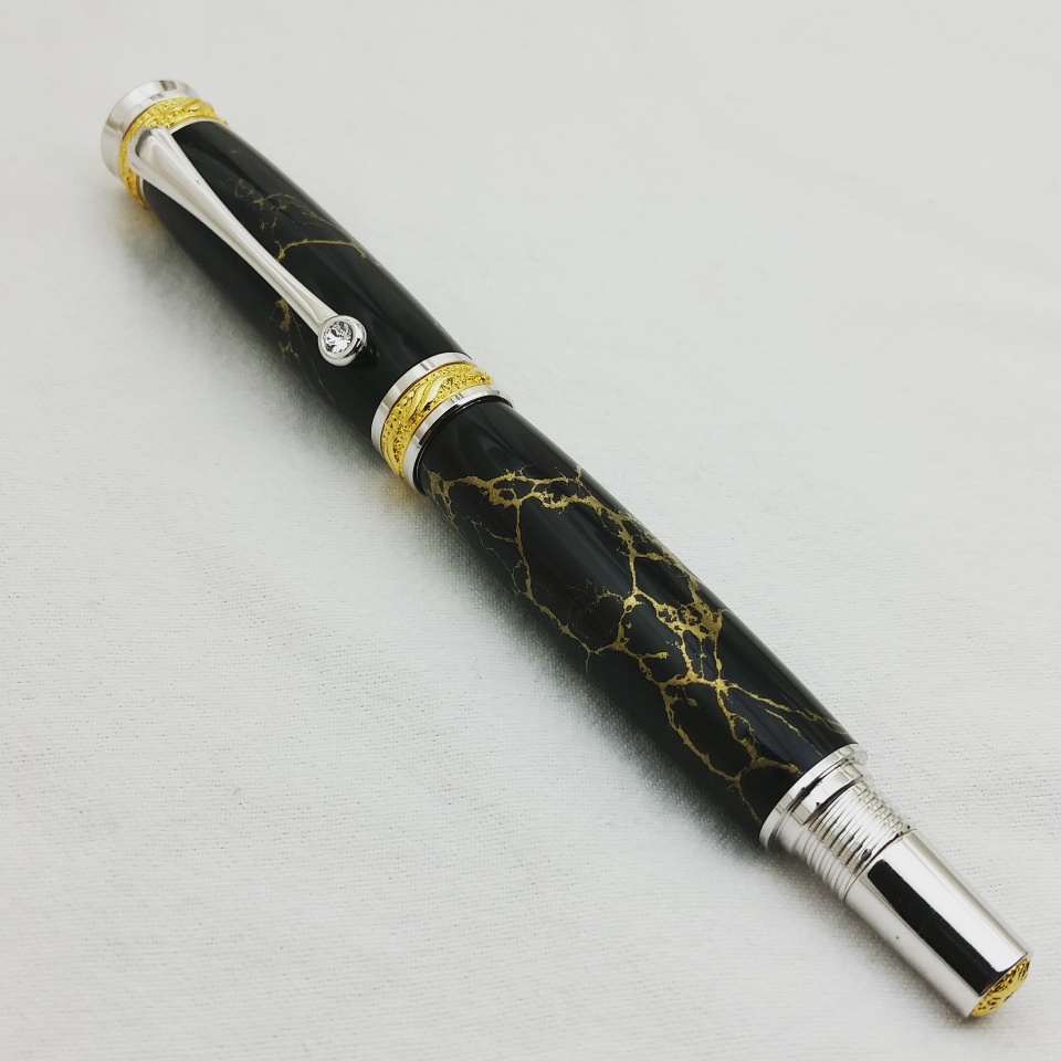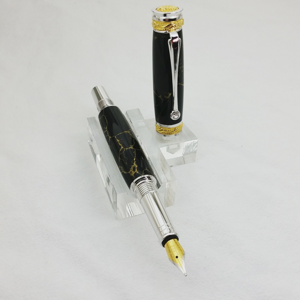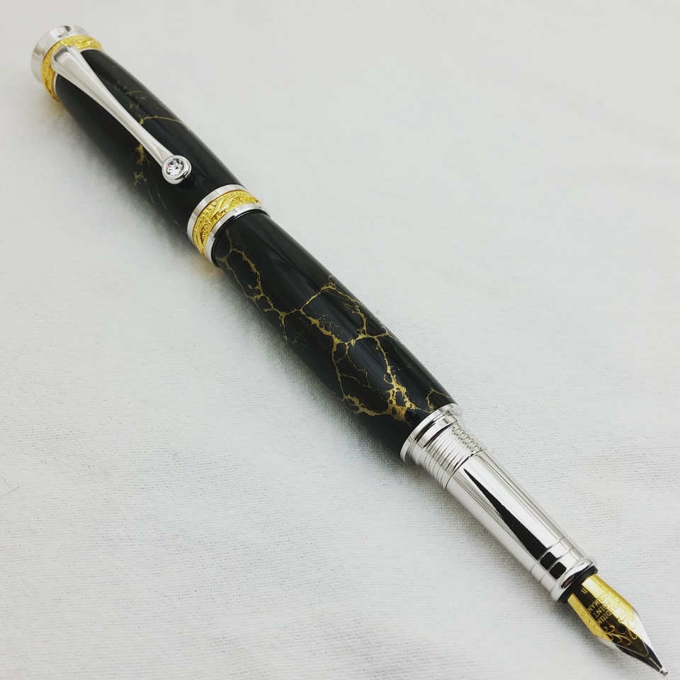 I made this Majestic Jr. out of black and gold matrix tru-stone and the only trouble I had was drilling the blanks out. When ever I drill through tru-stone the drill bit blows the ends out. I've tried using brad-point and standard drill bits but neither of them give me a clean hole at the end. On this pen, however, I left enough room so that the blow-out did not affect it. I appreciate any tips or advice.