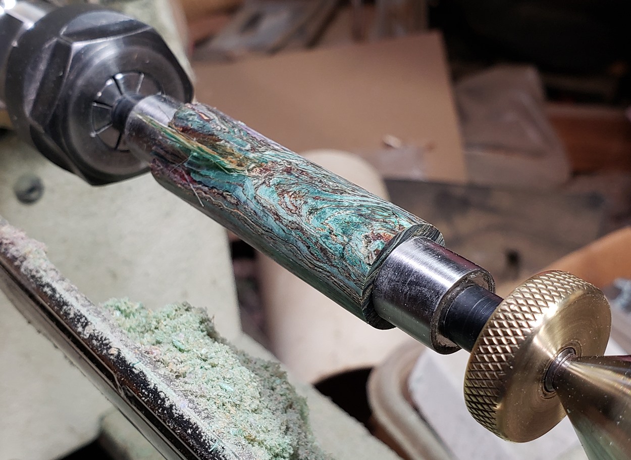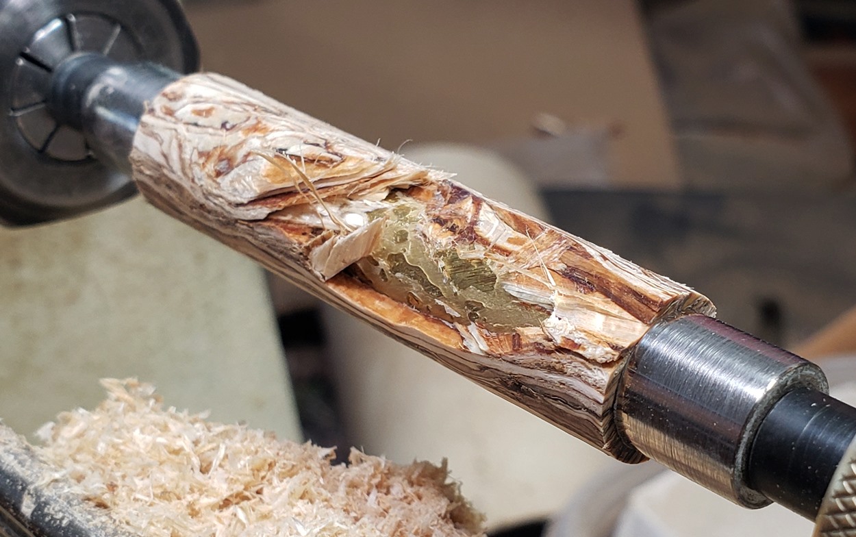 Sounds a lot like trustone and its variants. Those also "powderize"...you can get these little flakes, but if you touch them then instantly crumble into powder.Thanks. I had heard how finnicky HempWood was to turn, so I went very slowly. I ran the lathe at 3500rpm and took very shallow cuts with my carbide tool. I ended up with a pile of powder instead of sawdust or chips. I stopped several times to rotate the cutter to a fresh edge. It took me about a half hour to turn, There was one point early on that a big chunk blew out, but I had enough meat left on the blank, so I kept turning and it ended up ok,