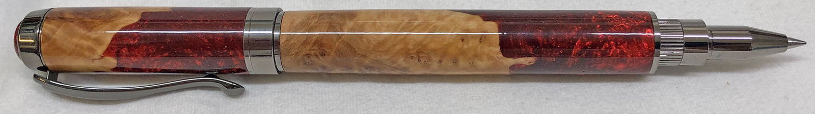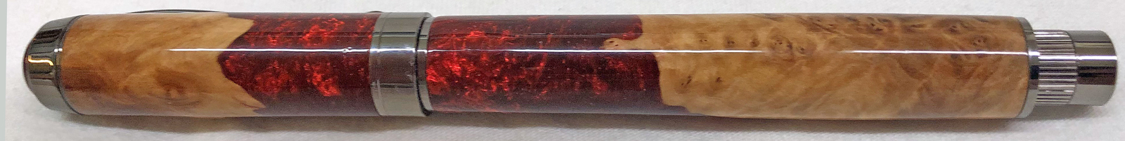 The blank is a hybrid that I bought from Dawn and Ed at the MPG in Chicago this year. I don't know the species for sure, but I am 99% certain that it is an Australian burl. The components are a hybrid of a Gunmetal Magnetic Graduate with a Gunmetal Diamond Knurl Rollerball cap and clip with a custom cabochon made from the little surplus end of the blank. Both kits use a 12.5mm tube for the cap so I used a Diamond Knurl Rollerball cap bushing and replaced the Magnetic Graduate cap and clip assembly with the Diamond Knurl cap and clip. I think this is my favorite pen so far. I really like the Magnetic Graduate except for the cap-clip assembly. I think the Diamond Knurl Rollerball's Cap and Clip design compliment it nicely. It is finished with GluBoost.