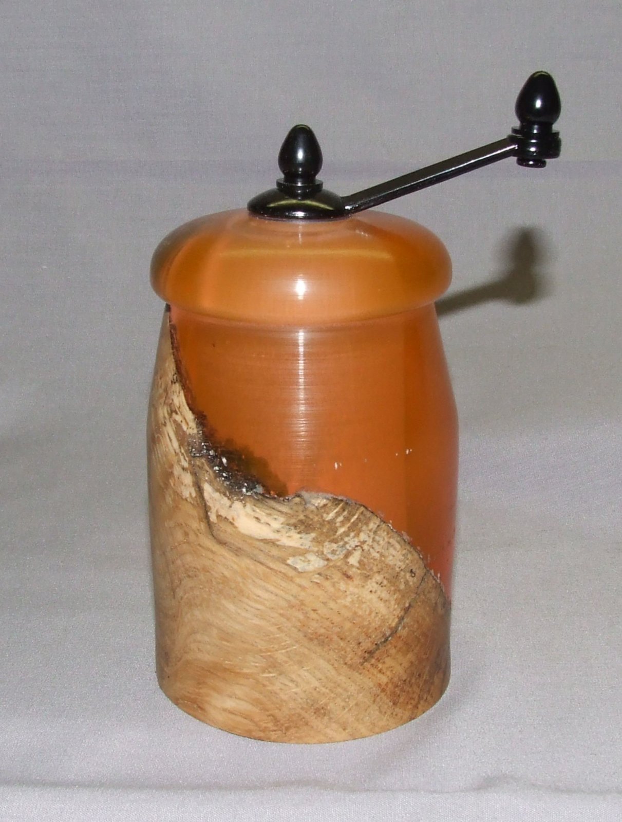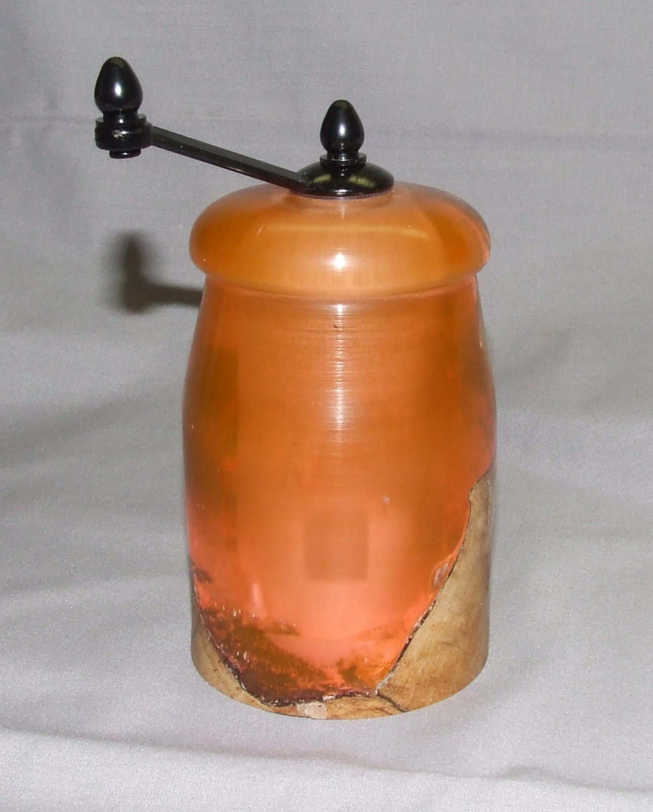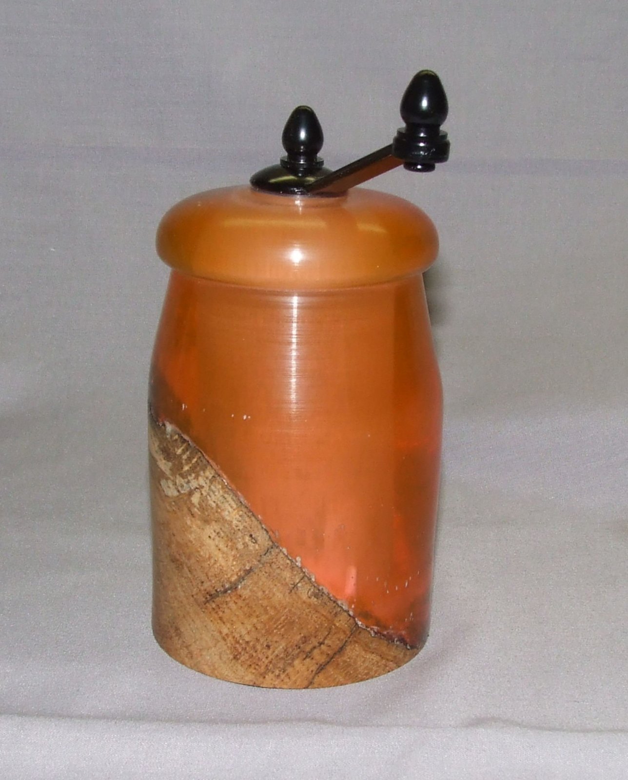 A friend that was getting out of his turning shop and selling and giving away all his tools and wood gave me a half can of silmar 41.... I'd never worked with resins before, but thought it would be fun and since I don't have a pressure pot and silmar 41 doesn't need pressure to set, I tried an experiment. I had a box of plastic boxes that I think I bought years ago to use as bottle stopper boxes or something along that line, but never used them.... they were 6" high, sooooo I thought a perfect mold for a midi pepper mill blank.... two problems occurred, 1. Silmar shrinks slightly as it cures... the blank was too short for a midi pepper mill... 2. the plastic in the mold stuck to the silmar and had to be turned away.... so I cut it down to a mini mill.... a chunk of white oak burl and the silmar dyed with orange alcohol ink... made it opaque which I liked....