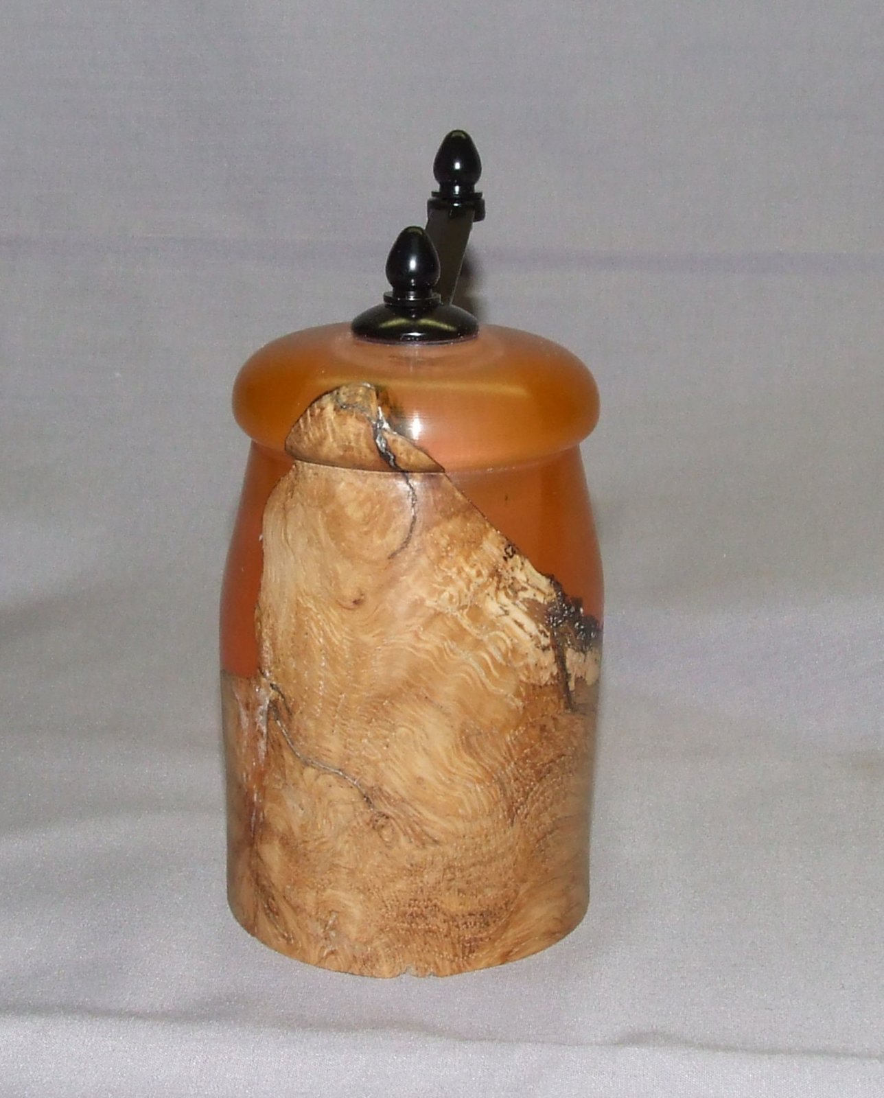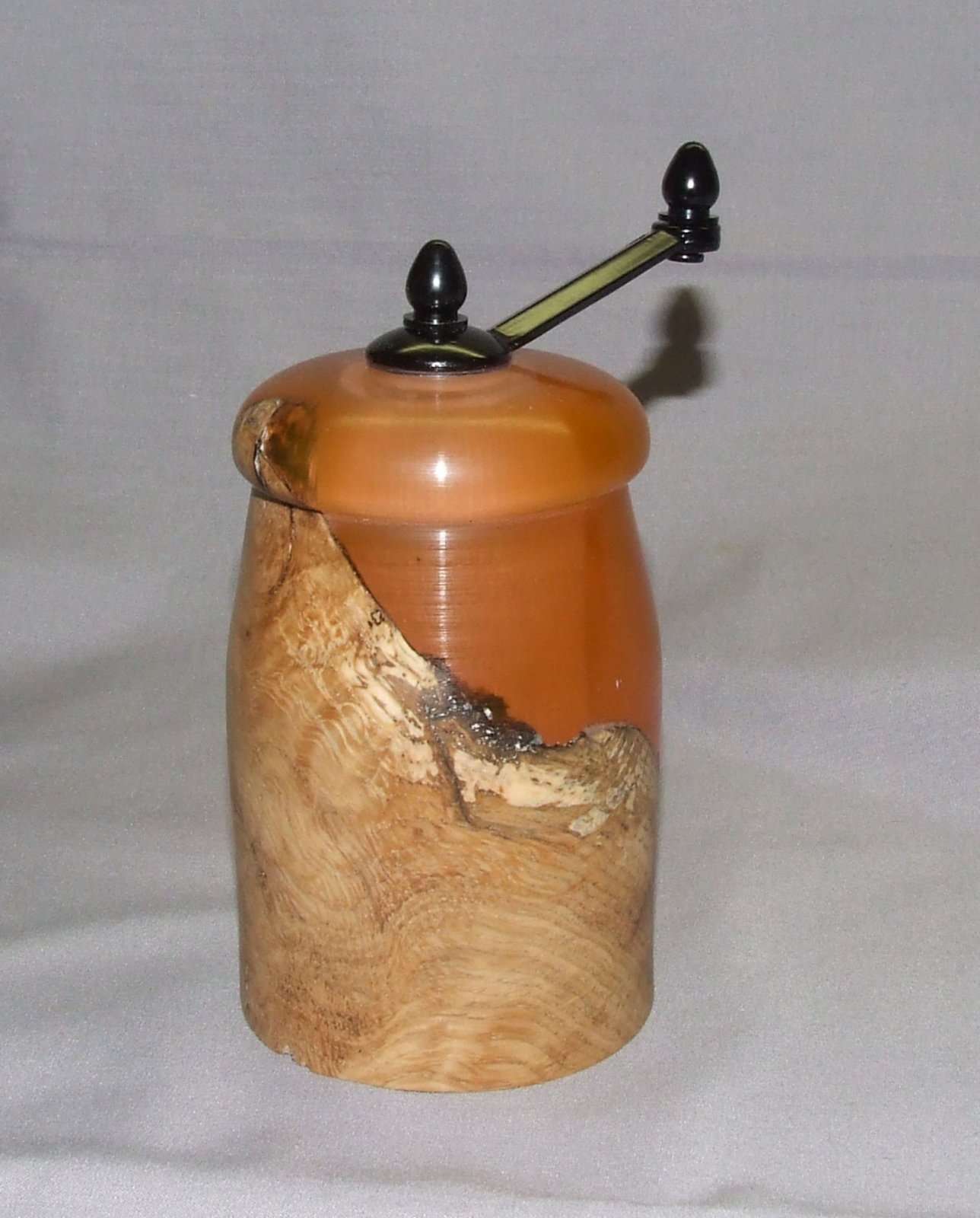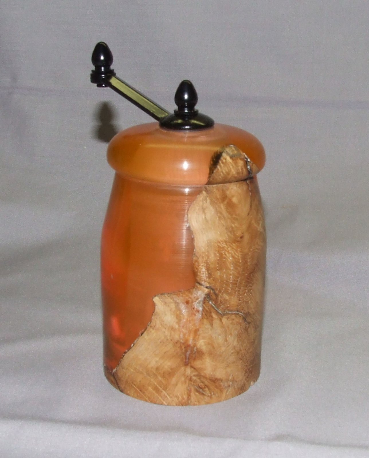 A friend that was getting out of his turning shop and selling and giving away all his tools and wood gave me a half can of silmar 41.... I'd never worked with resins before, but thought it would be fun and since I don't have a pressure pot and silmar 41 doesn't need pressure to set, I tried an experiment. I had a box of plastic boxes that I think I bought years ago to use as bottle stopper boxes or something along that line, but never used them.... they were 6" high, sooooo I thought a perfect mold for a midi pepper mill blank.... two problems occurred, 1. Silmar shrinks slightly as it cures... the blank was too short for a midi pepper mill... 2. the plastic in the mold stuck to the silmar and had to be turned away.... so I cut it down to a mini mill.... a chunk of white oak burl and the silmar dyed with orange alcohol ink... made it opaque which I liked....