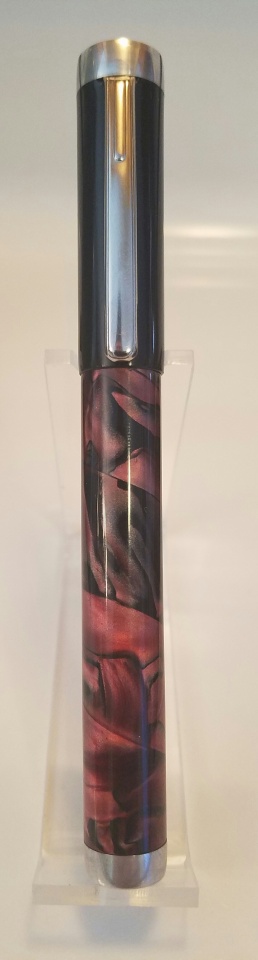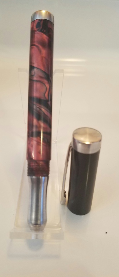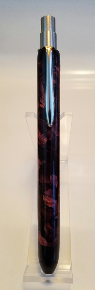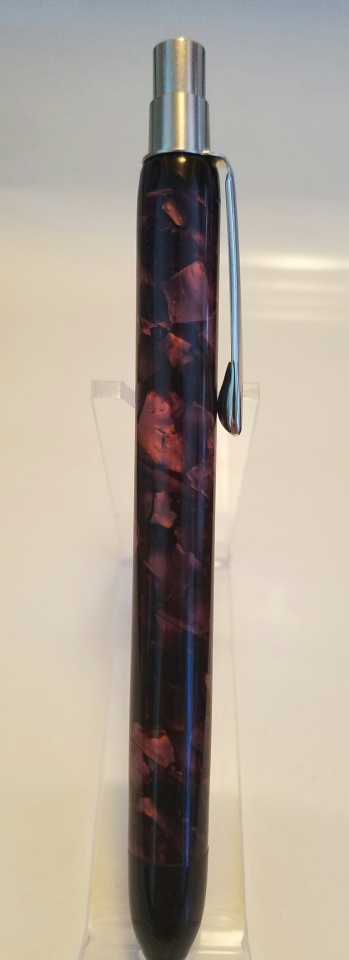 The clicker is smooth as silk thanks to Mbroberg giving me a clicker. The one I got was grabby and not functioning properly. I still have to shorten the nose cone a tiny bit now that the clicker is working properly. It's vintage red chunk cellulose acetate and alumilite for the black accent and nose cone.