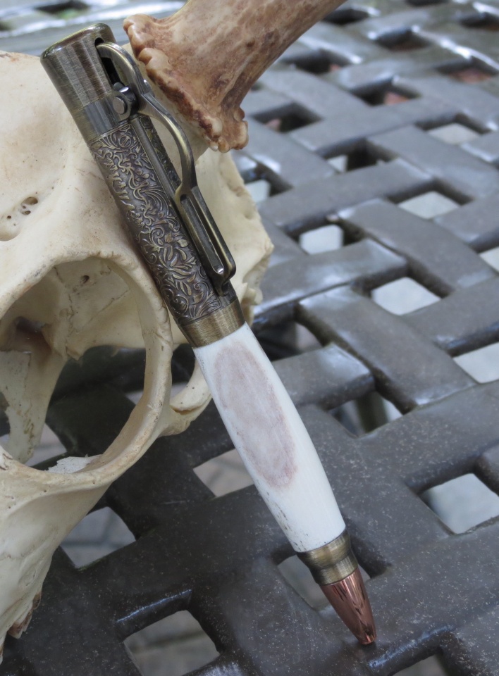 I really love this pen and the way the lever works the pen mechanism. Used deer antler. Applied a couple of coats of thin CA and sanded/polished with micro mesh.