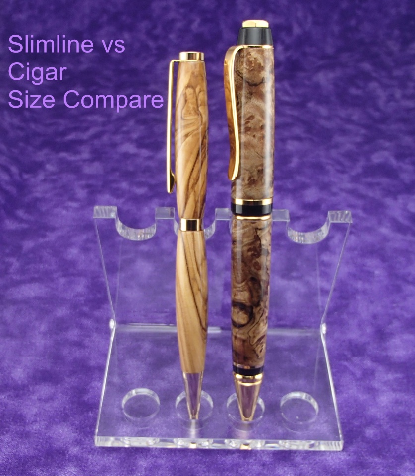 I've been around a while and figured it was time to start sharing. A slimline in holyland olivewood and a cigar in a big leaf maple blank from Rocky. I needed a size comparison picture for my sister in law. I hope this picture posting works out ok.