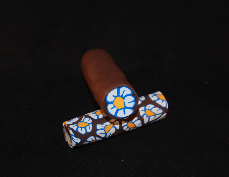 2nd picture is the cane not fully rolled out, and another tube baked and ready to turn. I had a couple of blanks where the clay section didn't seem to seamlessly blend together. Not sure how to describe it, but if you're familiar with injection molding they're like "flow lines."