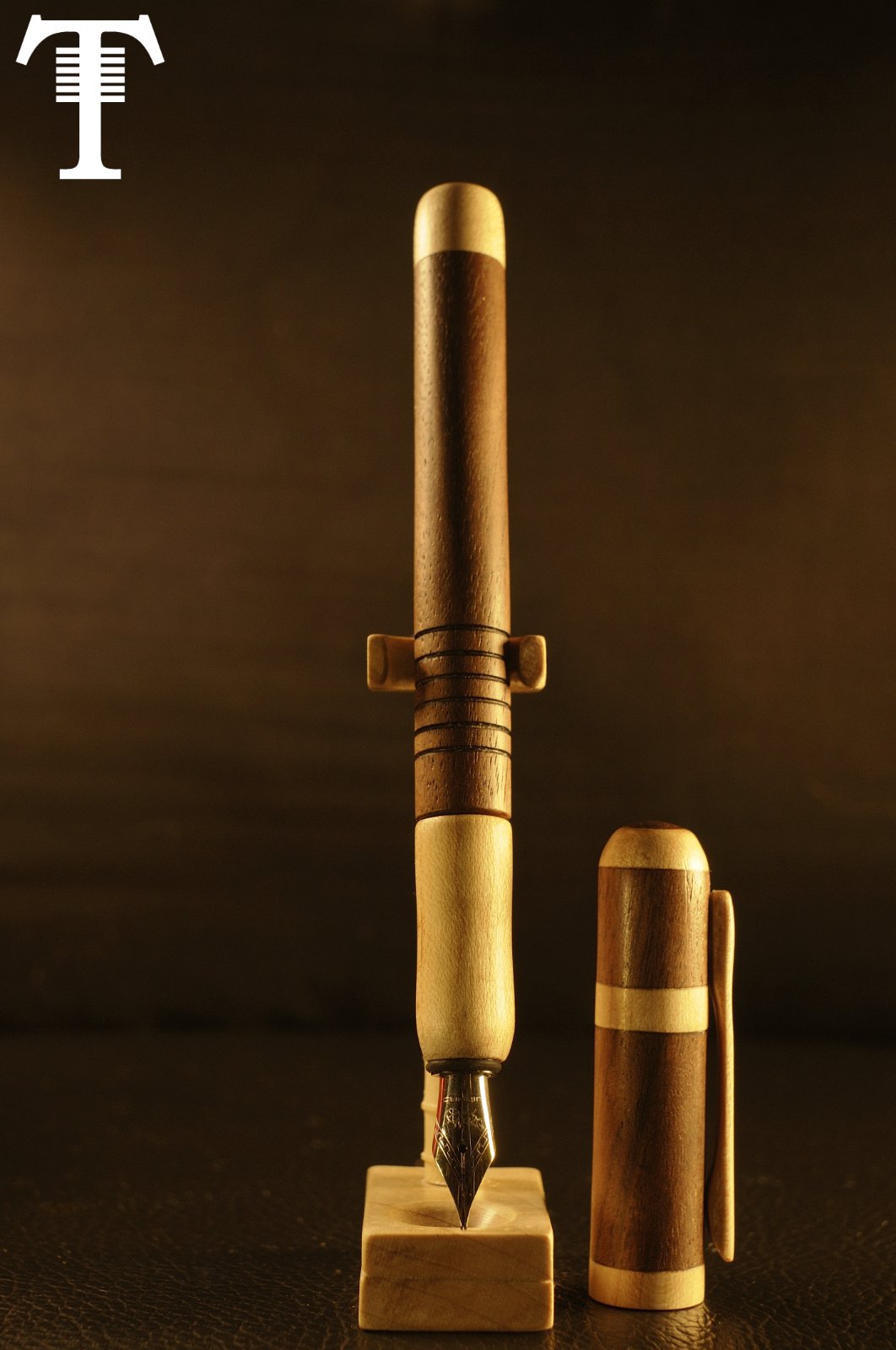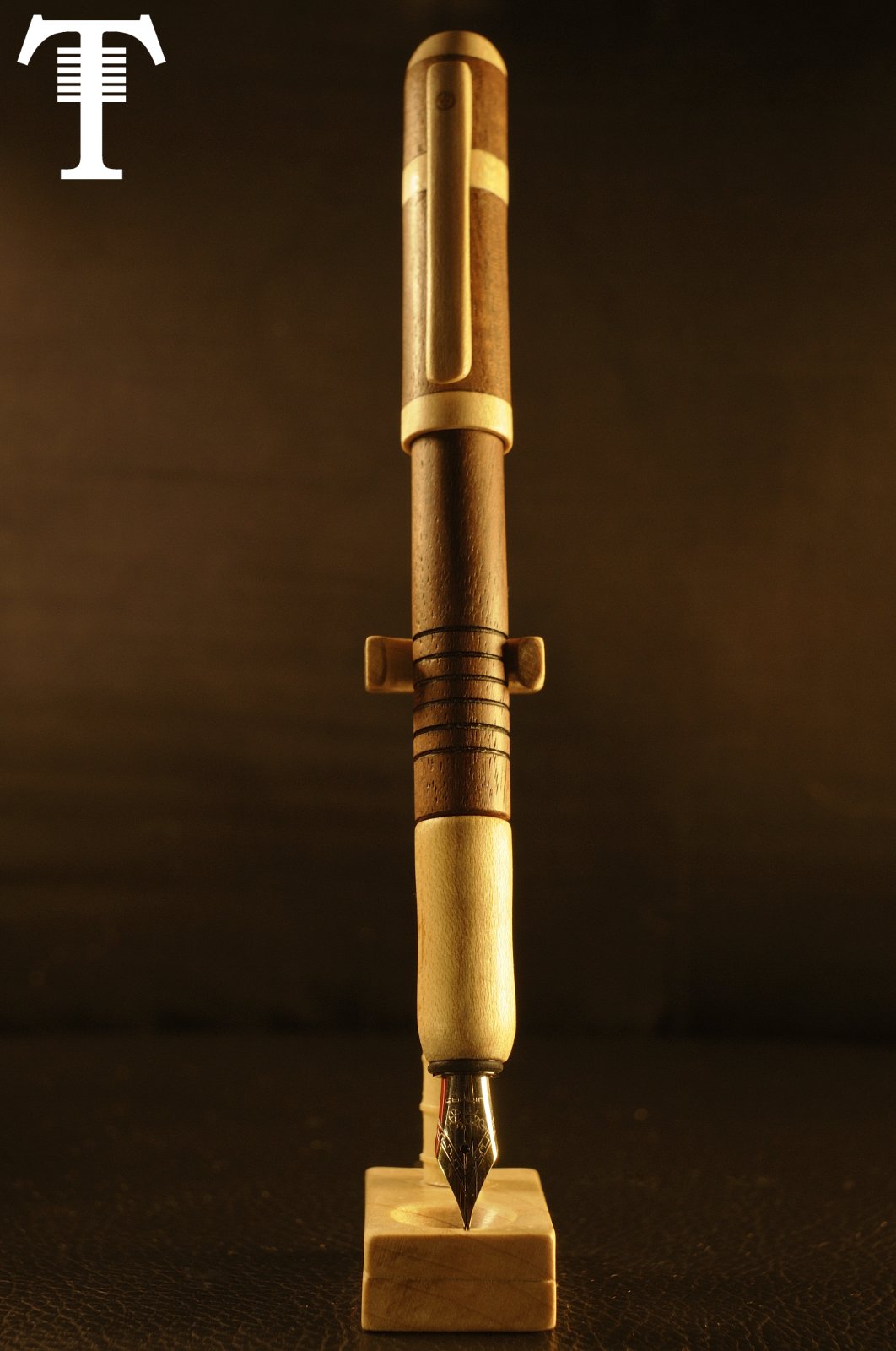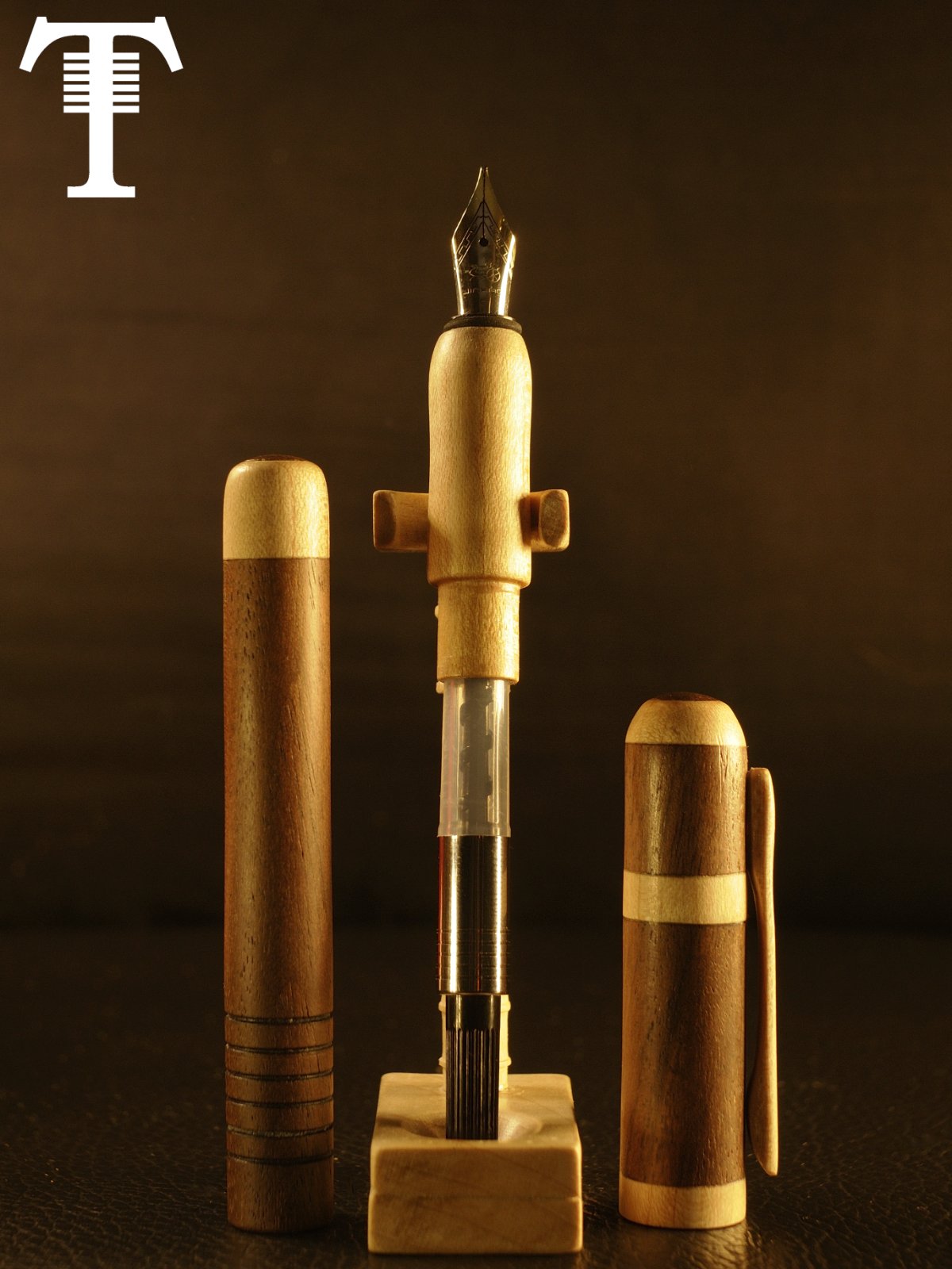 It's made of Black Walnut with Hard Maple accents. It will also be available in the reverse - Hard Maple with Walnut accents. It is ALL wood INCLUDING the clip. The only exceptions are the nib assembly and ink converter. All press fit as well. No threads! The lines behind the nib section are burned in with strings from my own guitars. The nib itself is a Jinhao 82 - sport tuned by me. The body's maximum OD is 11.5 mm and the entire thing, full of ink weighs in at about a quarter ounce. I am going for a very old craftsman like vibe with this one. Sanding is only down to 400 grit and finish is handrubbed shellawax so that you FEEL the wood. It will patina with the user's hands over the years. I'm very proud of it and want to know what the community thinks as I very must respect the opinions of the experts here!