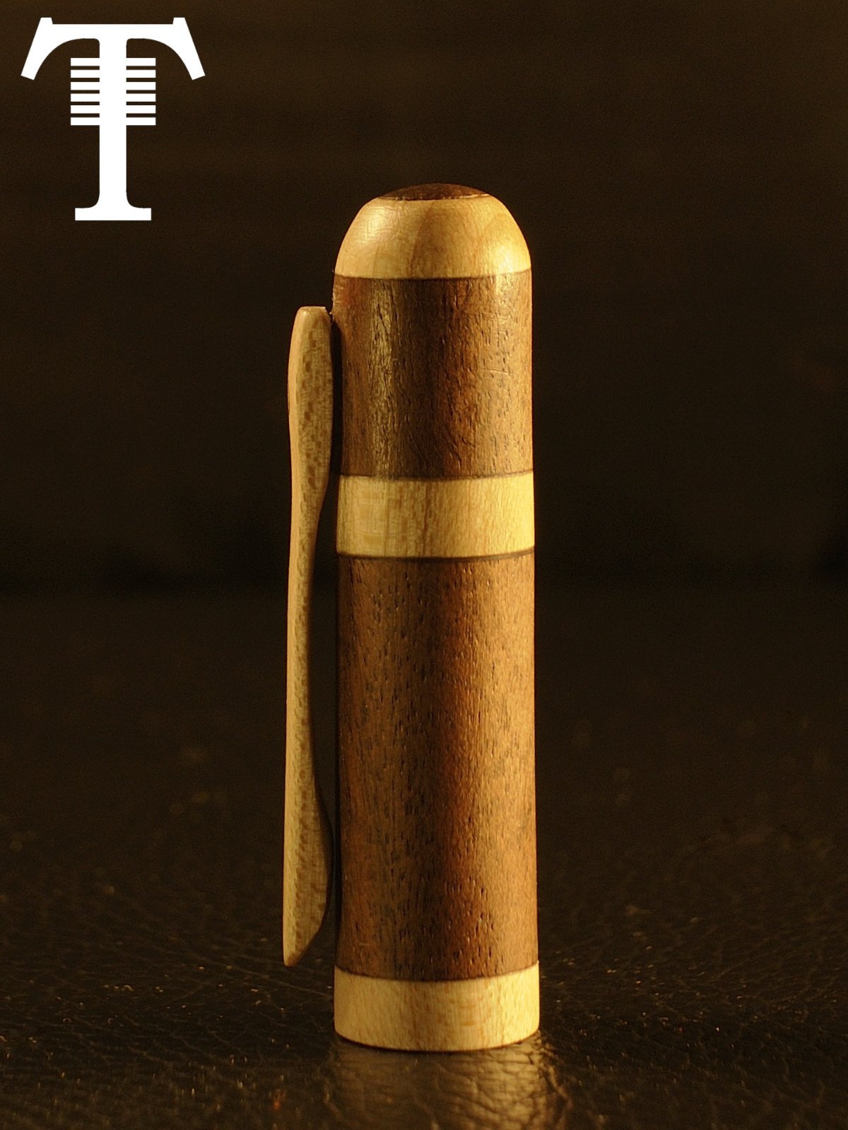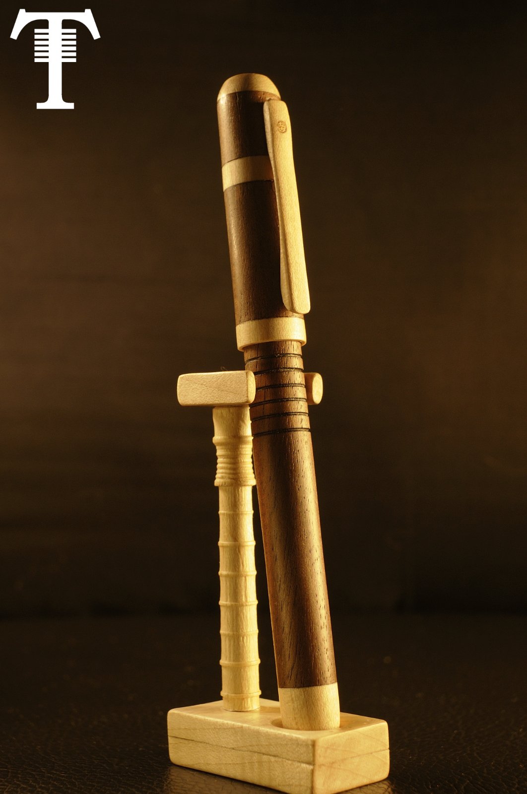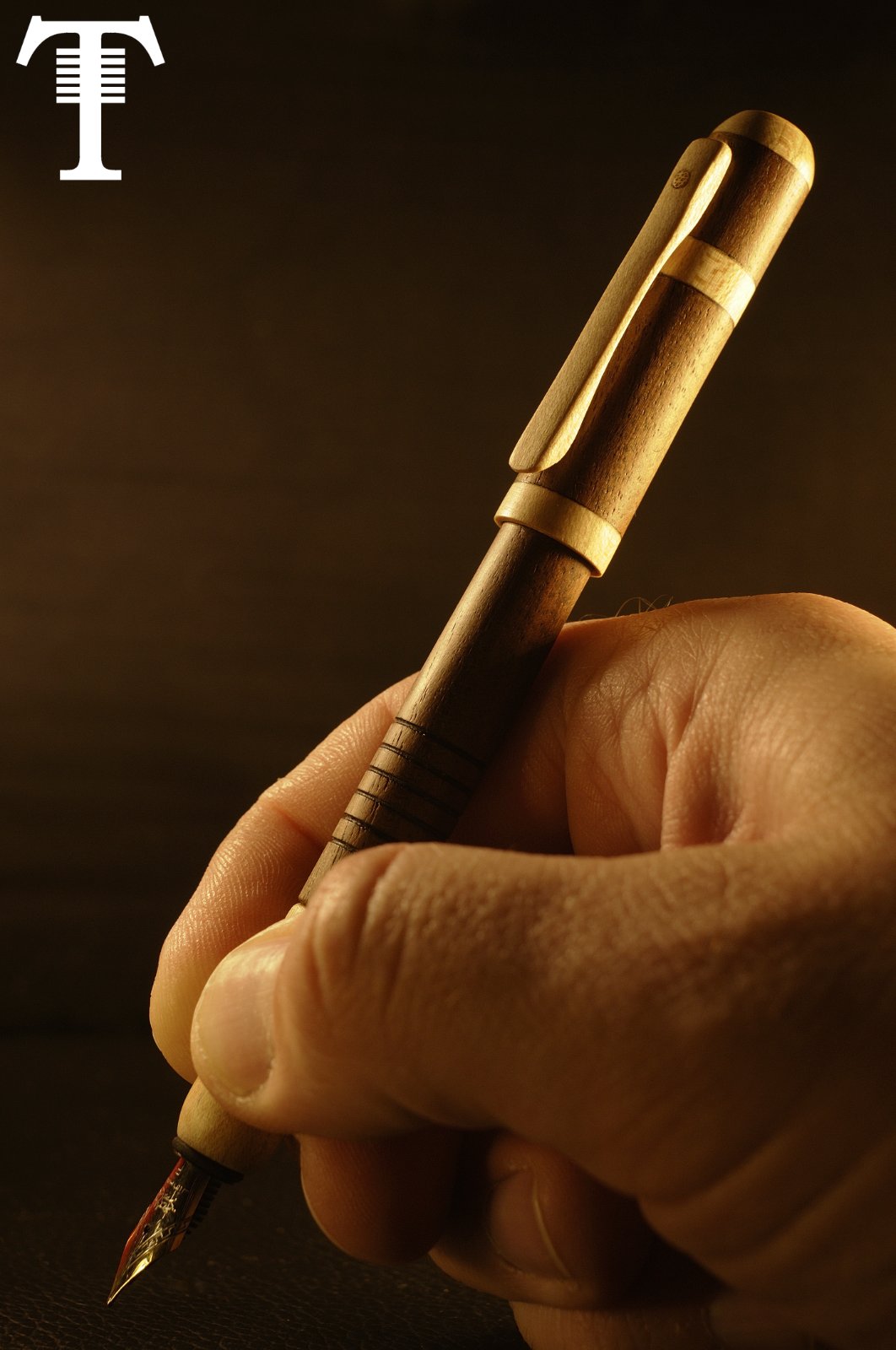 It's made of Black Walnut with Hard Maple accents. It will also be available in the reverse - Hard Maple with Walnut accents. It is ALL wood INCLUDING the clip. The only exceptions are the nib assembly and ink converter. All press fit as well. No threads! The lines behind the nib section are burned in with strings from my own guitars. The nib itself is a Jinhao 82 - sport tuned by me. The body's maximum OD is 11.5 mm and the entire thing, full of ink weighs in at about a quarter ounce. I am going for a very old craftsman like vibe with this one. Sanding is only down to 400 grit and finish is handrubbed shellawax so that you FEEL the wood. It will patina with the user's hands over the years. I'm very proud of it and want to know what the community thinks as I very must respect the opinions of the experts here!