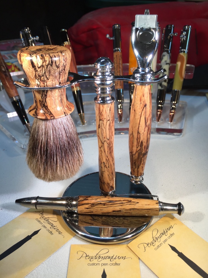 Had one of my wives coworkers ask if I could make a Razor Set for her boyfriend as a Christmas gift. She was picky about the shape of the brush. I finished the set today and just about kept it for myself. Made from Spalted Tamarind and it turned out real nice. She also requested a matching pen for the shaving set. All feedback accepted.