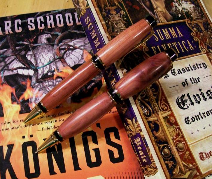 Here's the first two pens I've made. Gold cigar pen and pencil in cedar that I 'milled' myself, with a CA finish. Still haven't figured out how to get the swirl marks out of the finish yet.