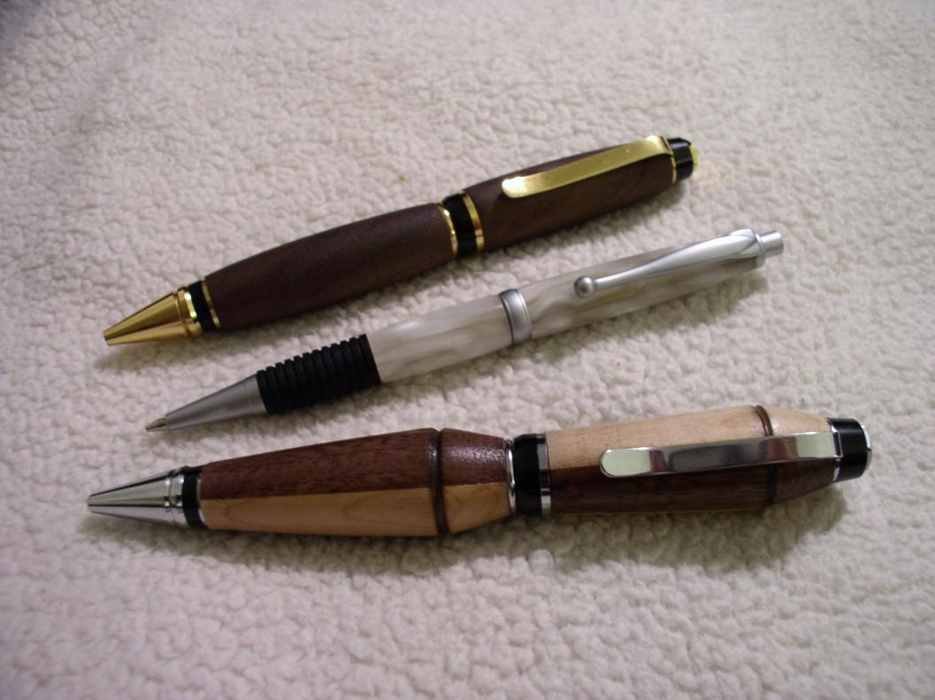 I've only been using the lathe for about two maybe three months. Ok, here goes nothing. Here are my first two pens and my first pencil. Top to bottom. First pen a gold cigar made of walnut with butcher block oil finish. Second a comfort pencil (for my daughter) made of pearl PR (from Woodcraft). You can still see the brass tube, oops, she likes the tint it gives. Of course she could be just saying that. Lastly a chrome cigar made of walnut and maple finished with about ten coats of polycrylic spray.