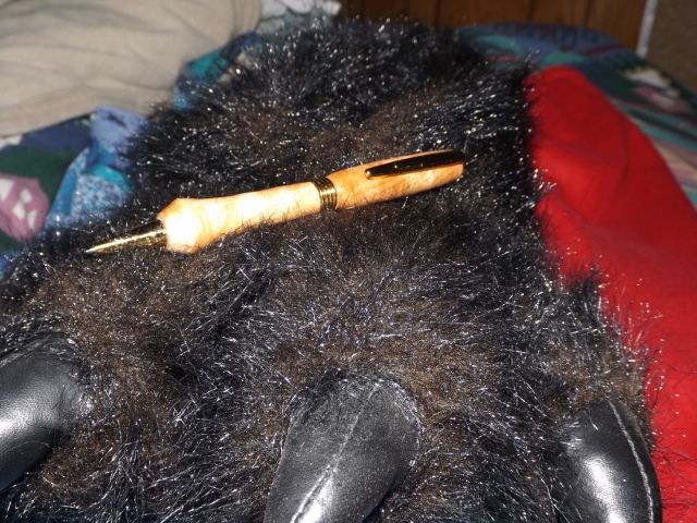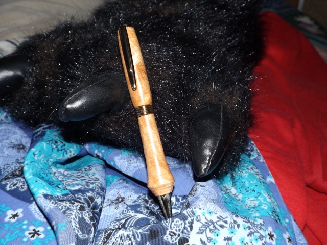 I had this piece of curly maple sitting on the floor that I had cut a bowl out of on the scroll saw and I kept looking at it. Thought a pen would be great to make out of that piece of wood. So I cut out a pen blank on the diagonal and then made the pen out of it. First off there was a pen that I had started and the wood broke in several places so I worked the rest off with a box cutter so then I was able to use the brass tubes for this pen. Not the greatest but I love the way the curly maple seems to roll when you move the pen... Enjoy Fay P. S. My bear paw slipper and clothes sort of take away from the pen ,but I haven't had a chance to fix up a picture taking place yet...