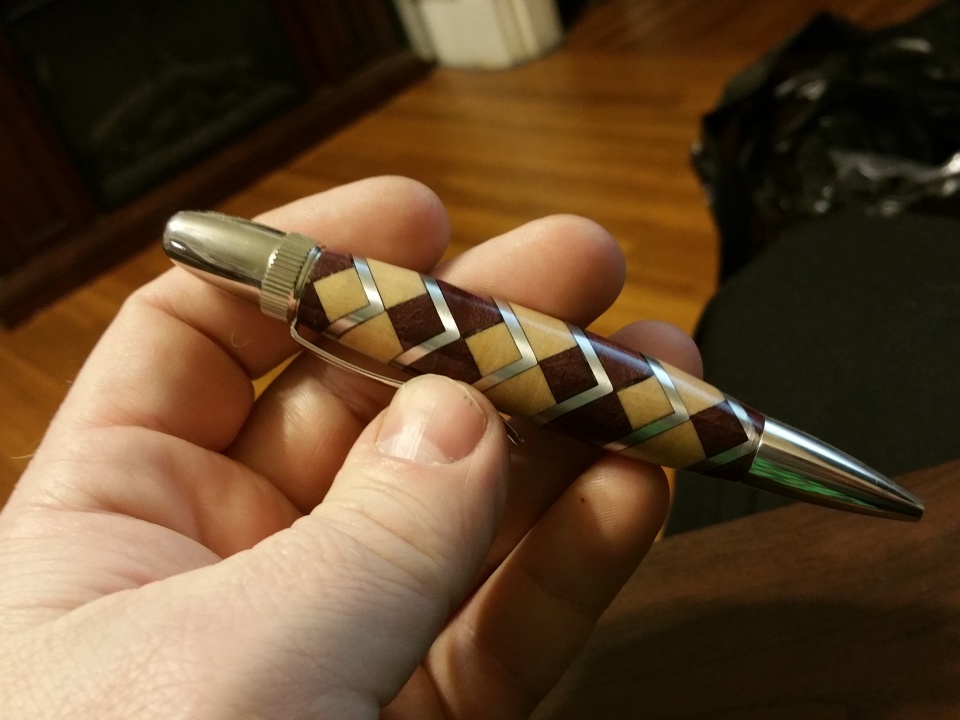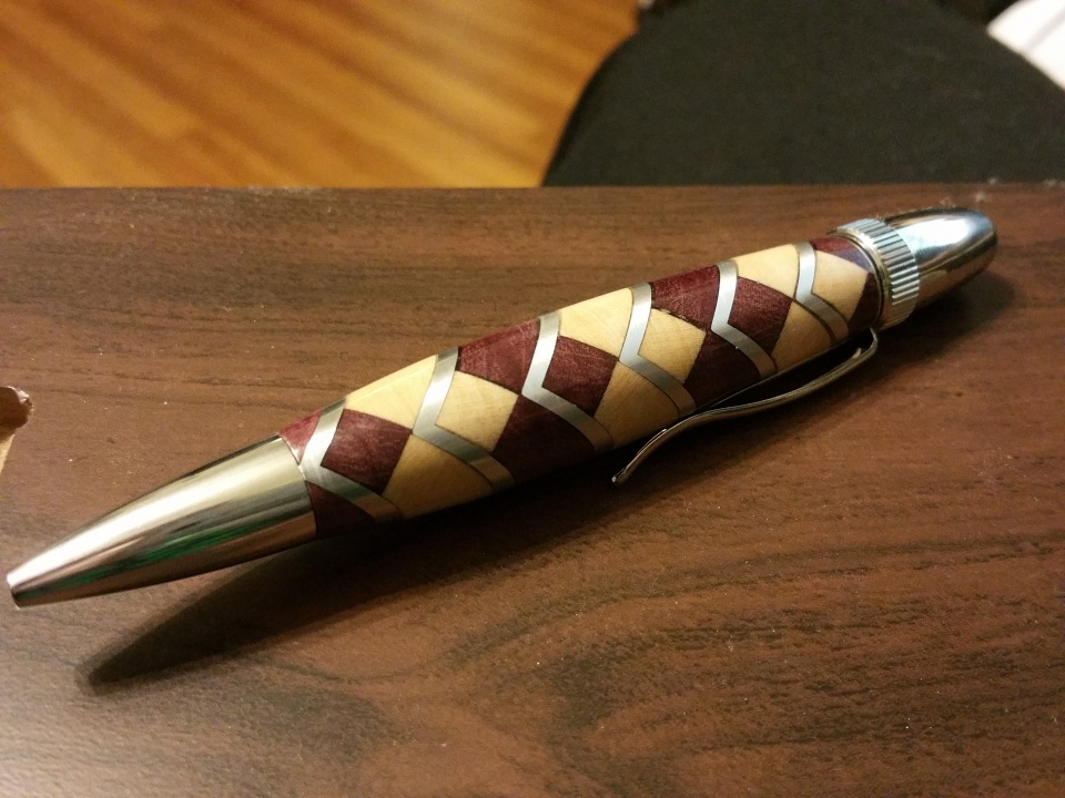 This is not my best photography, but it is one of my best segmented pens yet. It is maple, purpleheart and aluminum. I will try to get some better pictures later.